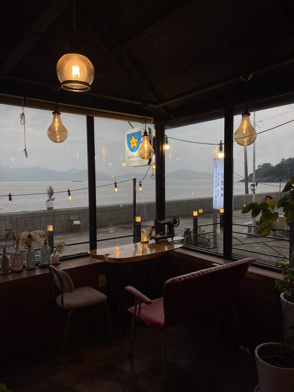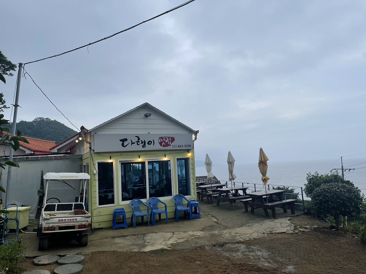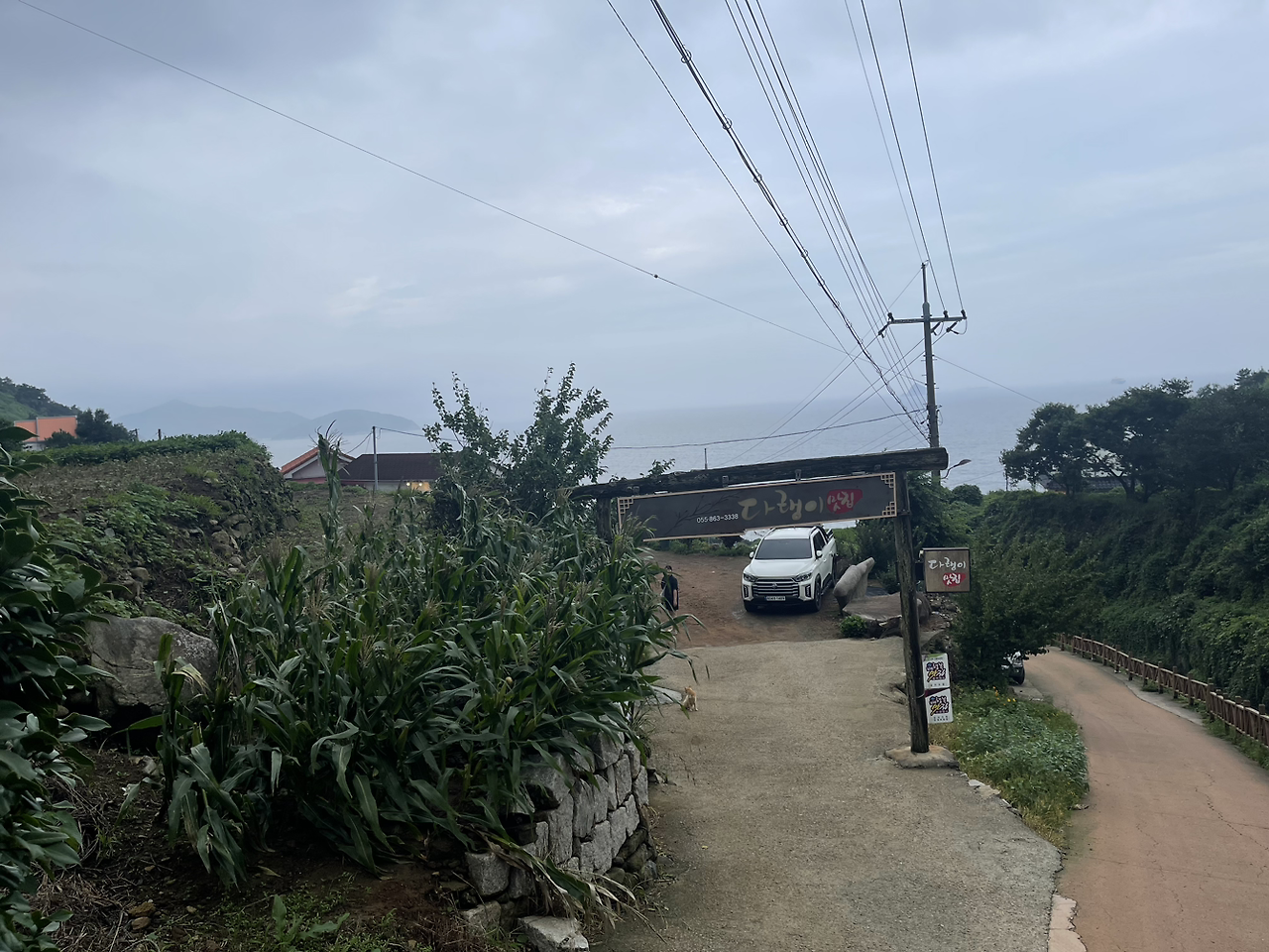 능선 제1주차장에 차를 주차하고 내리막 산길을 따라 내려가면 식당이 나온다. 마을의 모양새가 가파른 절벽에 있다 보니 이태리 산토리니 섬을 생각나게 한다. 절벽에 있는 집들이니 뷰가 좋은 것은 기본 중에 기본이다. '바다멍' 하기 좋은 곳이다. 칼국수와 해물전, 생선구이를 저녁메뉴로 결정한다. 해물전은 여름에 파 대신 부추를 넣어 지져주는데 얇게 썰어 넣은 오징어와 부추가 바삭하게 어우러져 일품이다. 여기서는 해물전이 위너다. 생선구이는 바닷가니 두말할 필요도 없다. 식사를 하고 바로 밑 카페에서 비린 입을 씻을 커피를 먹고 싶었으나 곧 닫을 시간이라 포기하고 호텔 근처 9시까지 한다는 카페로 복귀하려 한다.