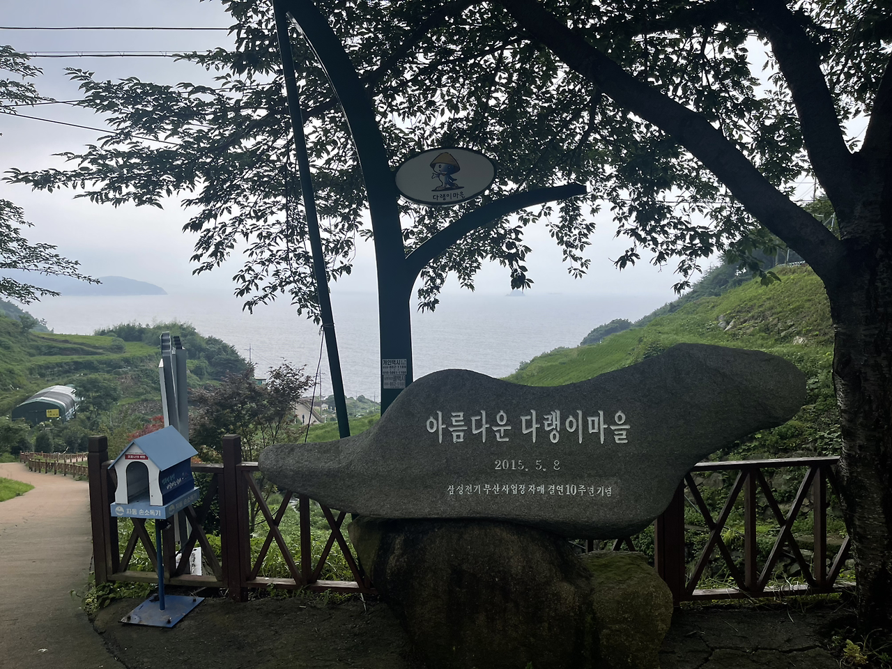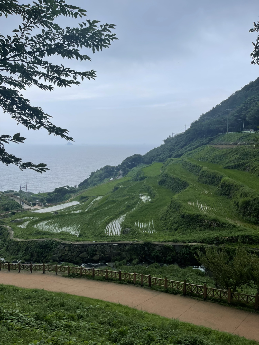 저녁은 칼국수와 해물전, 그리고 생선구이 등 다양한 메뉴를 제공하는 다랭이맛집으로 결정한다. 해안선을 따라 바다를 즐기며 약 25분 남하하면 그 유명한 다랭이마을이 나온다. 직접 와 보면 현장감 정도의 장점이 있지만, 뷰의 질은 방송 등에서 드론으로 찌고 난리를 쳐서 보여주는 것이 훨씬 멋지다. 생각보다 계단 논 하나하나의 넓이가 작다. 아휴. 저만한 땅도 아까워 저리 논을 만들었구나 싶다. 호남의 너른 땅과 경상도의 척박한 땅 모양새가 비교된다. 이런 차이들이 기질의 차이를 만드러 낸 거지. 그리고 그 차이를 이해할 시간도 없이 여러 정치적 상황과 의도에 휘둘려 버린 거지. 어쨌든 드디어 방송으로만 보던 다랭이마을을 와 본 거다.