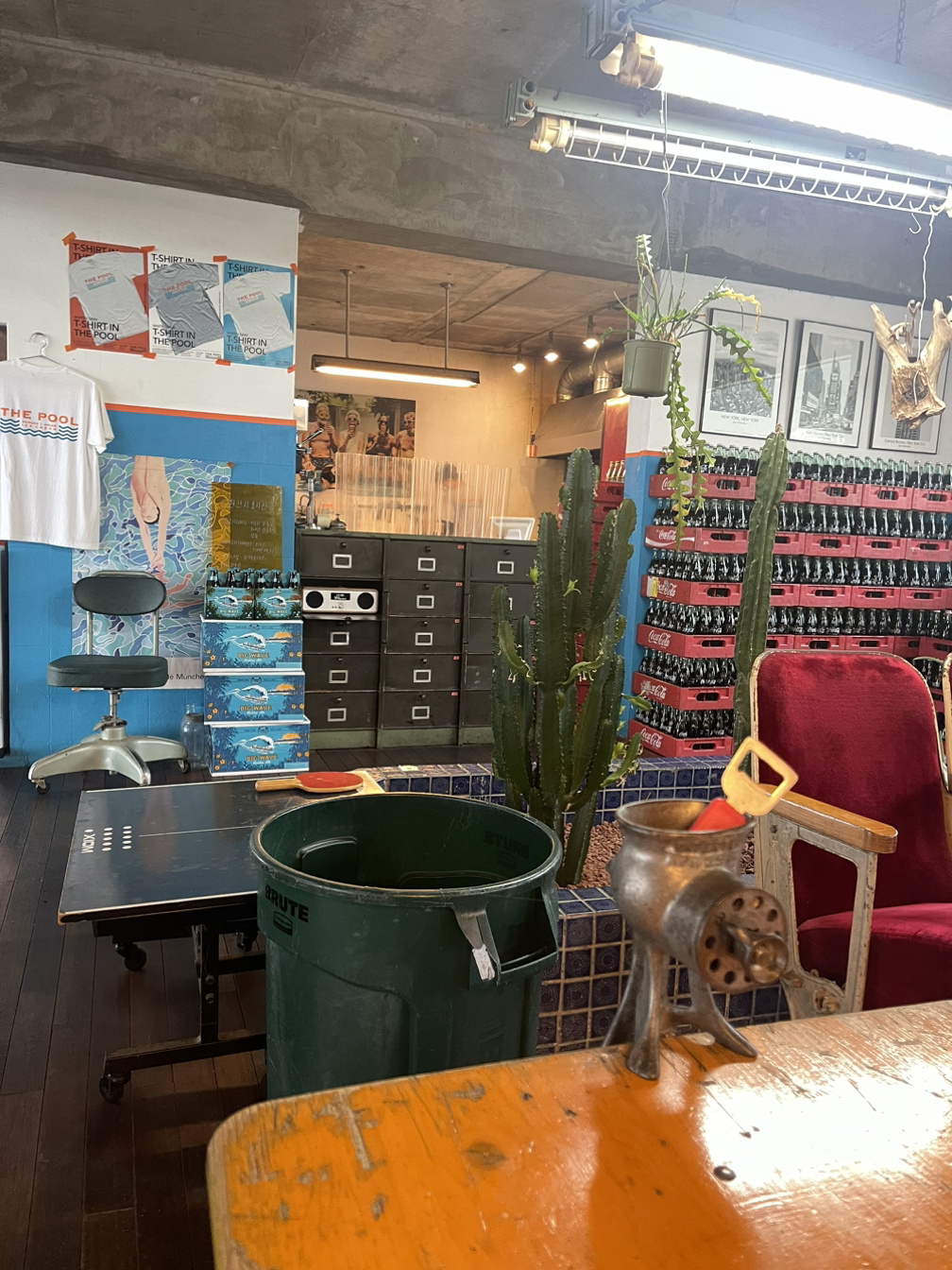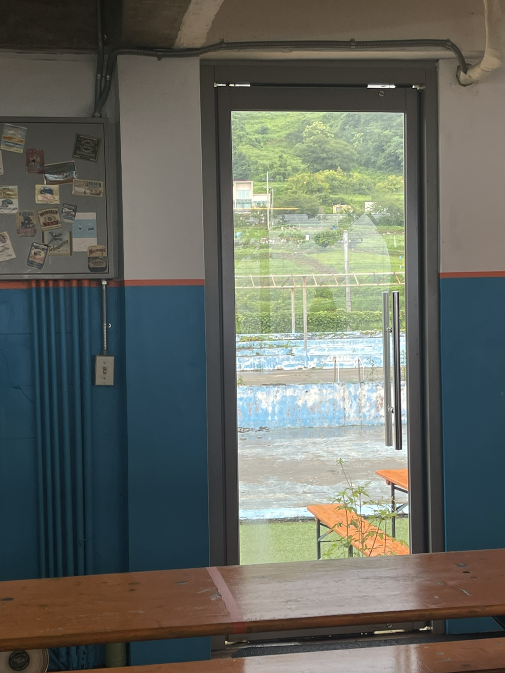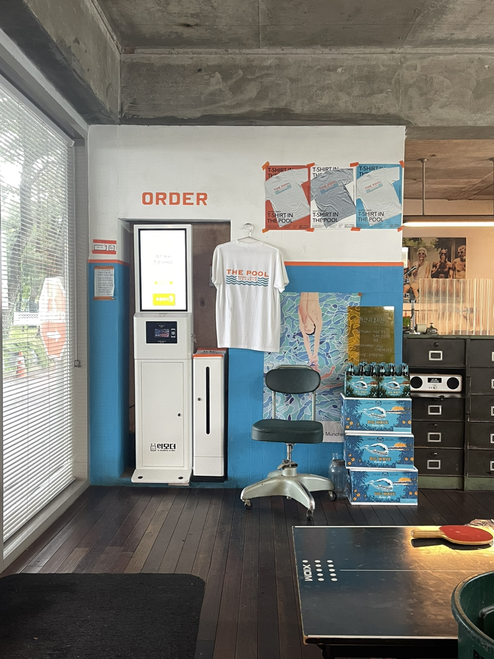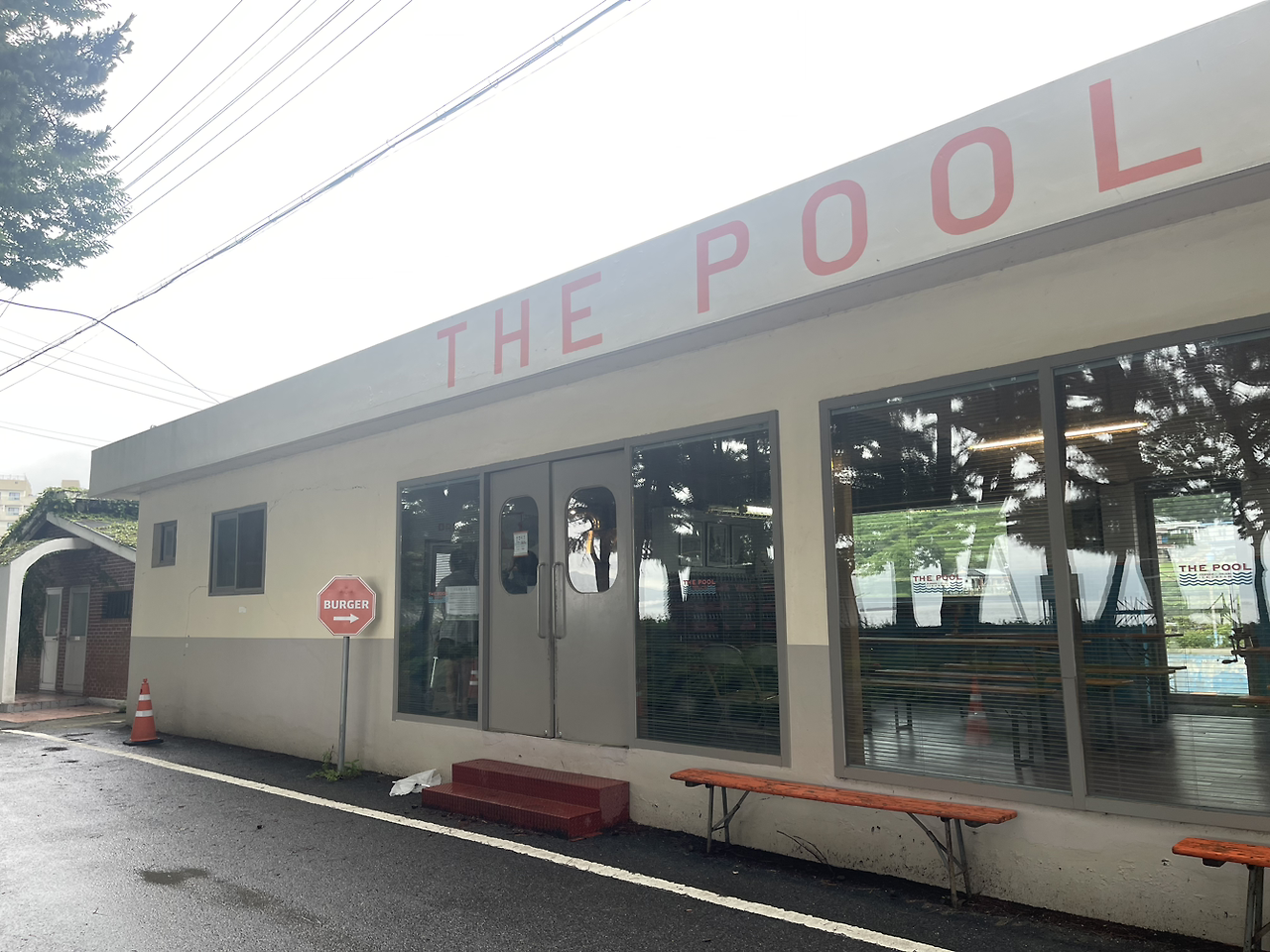 남해의 중심지 남해읍을 지나 산길로 시골길로 이동하며 모두는 "여기에 햄버거집이 있다고?" 하는 궁금증이 들었다. 종착지에 다가서니 해변가에 허름한 시멘트 건물이 있고 주차장 표식이 있다. 이름하여 더 풀. 폐 수영장에 햄버거 집을 만들었다. 들어서니 두 커플 손님이 있다. 분위기는 폐수영장과 어우러져 무척 감각적이다. 소품들, 쌓아놓은 코카 콜라 병 더미들이 말해주는 주인장 센스가 장난이 아니다.