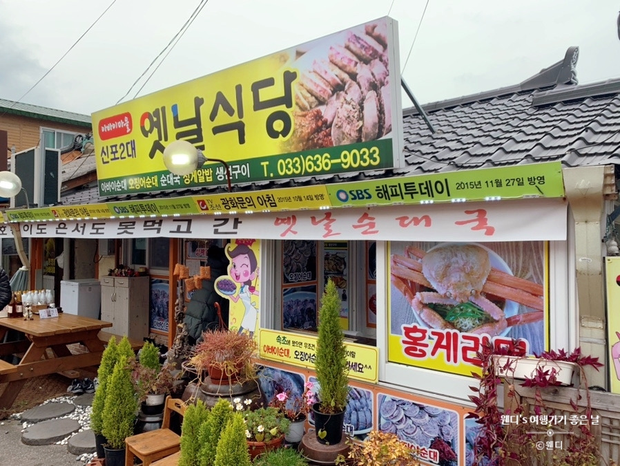 머니머니 해도 속초의 가장 유명한 곳은 아바이 마을이다. 분단과 실향의 아픔을 고스란히 간직한 곳이다. 이곳에는 먹거리도 많다. 옛날식당은 아바이마을 좁은 골목 중간쯤에 있다. B의 검색 추천 집이다. 오징어순대(소), 성게 미역국, 성게알 비빔밥을 주문했다. 성게가 제철이라 입안에서 녹는다 녹아. 맛있다. 이 근처 다녀본 식당들 중 최고인 듯하다. 오징어순대는 어딜 가나 어차피 맛있고, 오징어 젓갈 양념장 등의 간이 아주 심심한 게 일품이다.