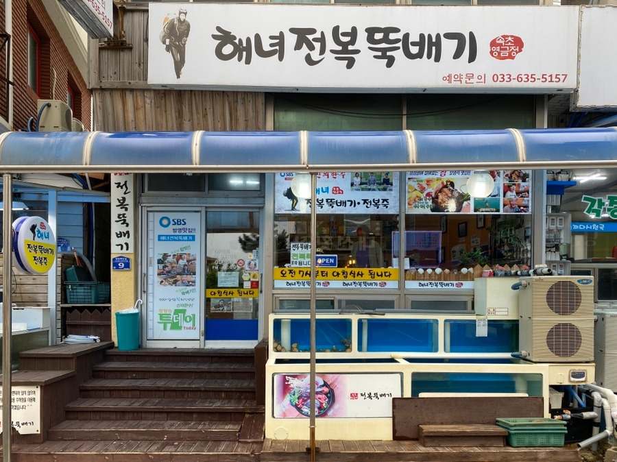 속초 동명항 바닷가 포장마차촌에 있다. 다른 집들에 비해 메뉴가 적으나, 이곳의 유명세를 만든 오리지널 집인 듯싶다. 양이 조금씩이라 우리 같은 소식가들에겐 부담스럽지 않아 좋다. 바닷가에서 먹는 회와 생선구이는 그 자체로 정답이다. 모둠회와 임연수어 구이 흡입