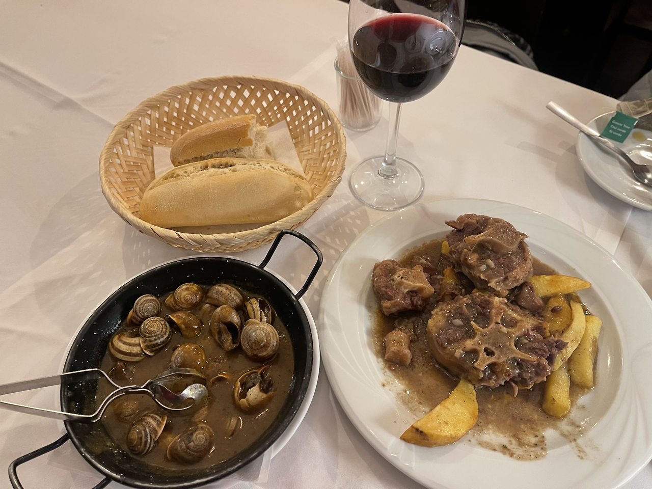호텔 식당인 듯한데 독립적으로 운영한다. 론다의 대표 음식은 Rabo de Toro라는 소꼬리 찜이다. 대표음식이니 이 메뉴와 달팽이 요리 하나를 주문한다. 구글 평점이 높은 곳은 아닌데 그냥저냥 먹을만하다. 와안 한잔을 곁들여 와인소스와 함께 먹는 요리 맛이 나쁘지는 않다. 가성비 나쁘지 않다.