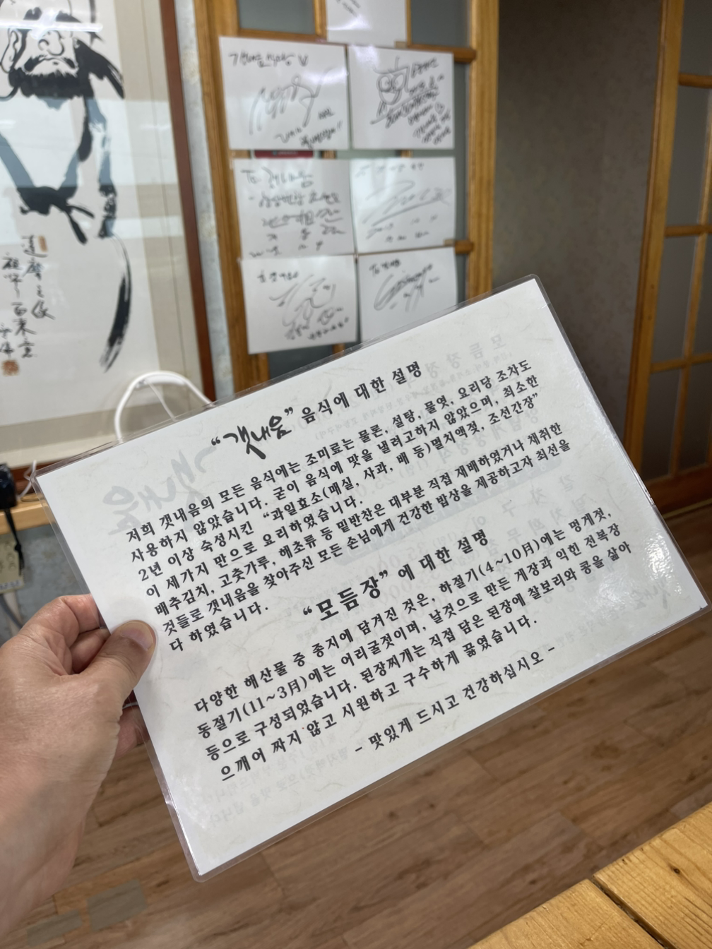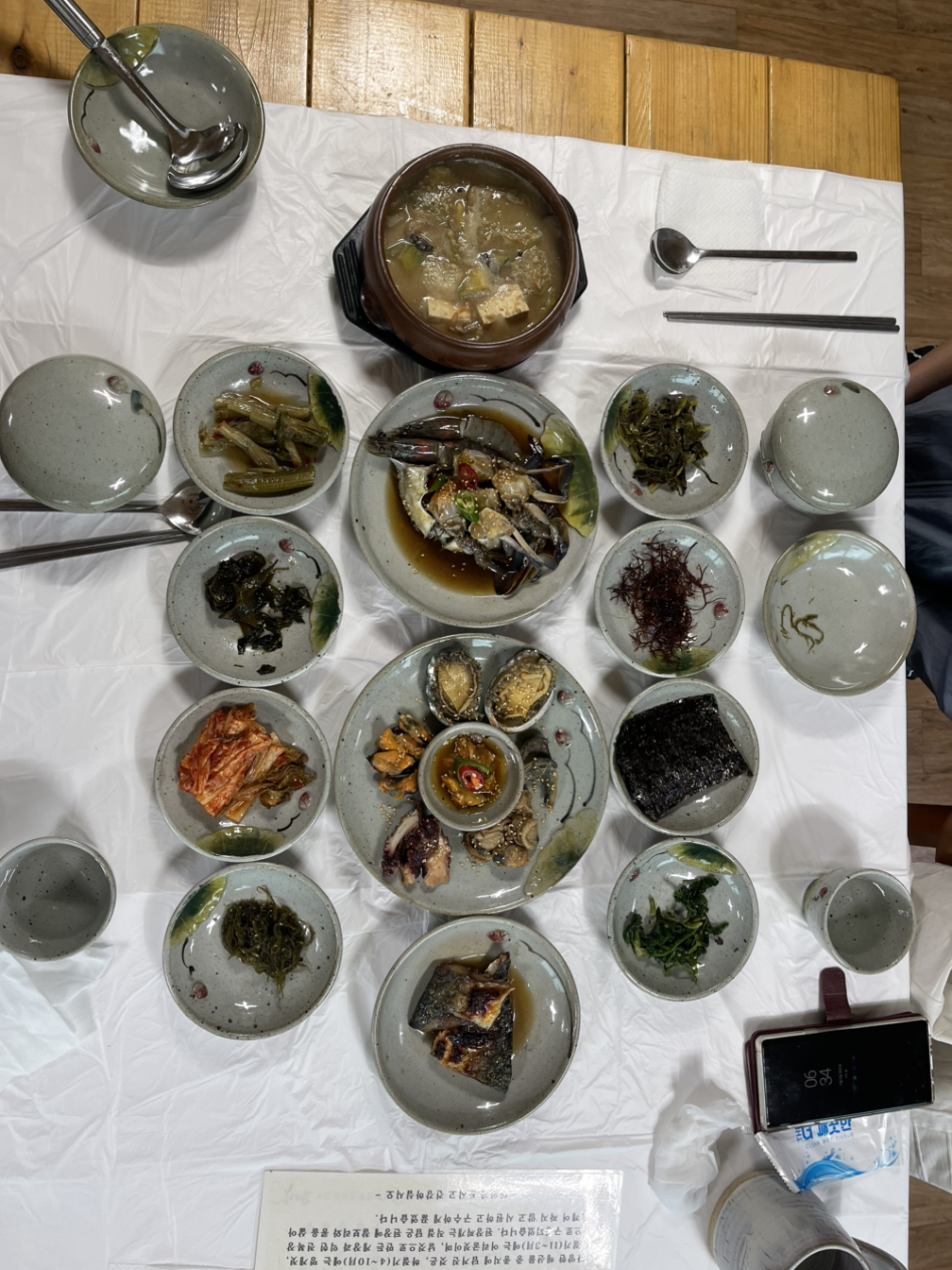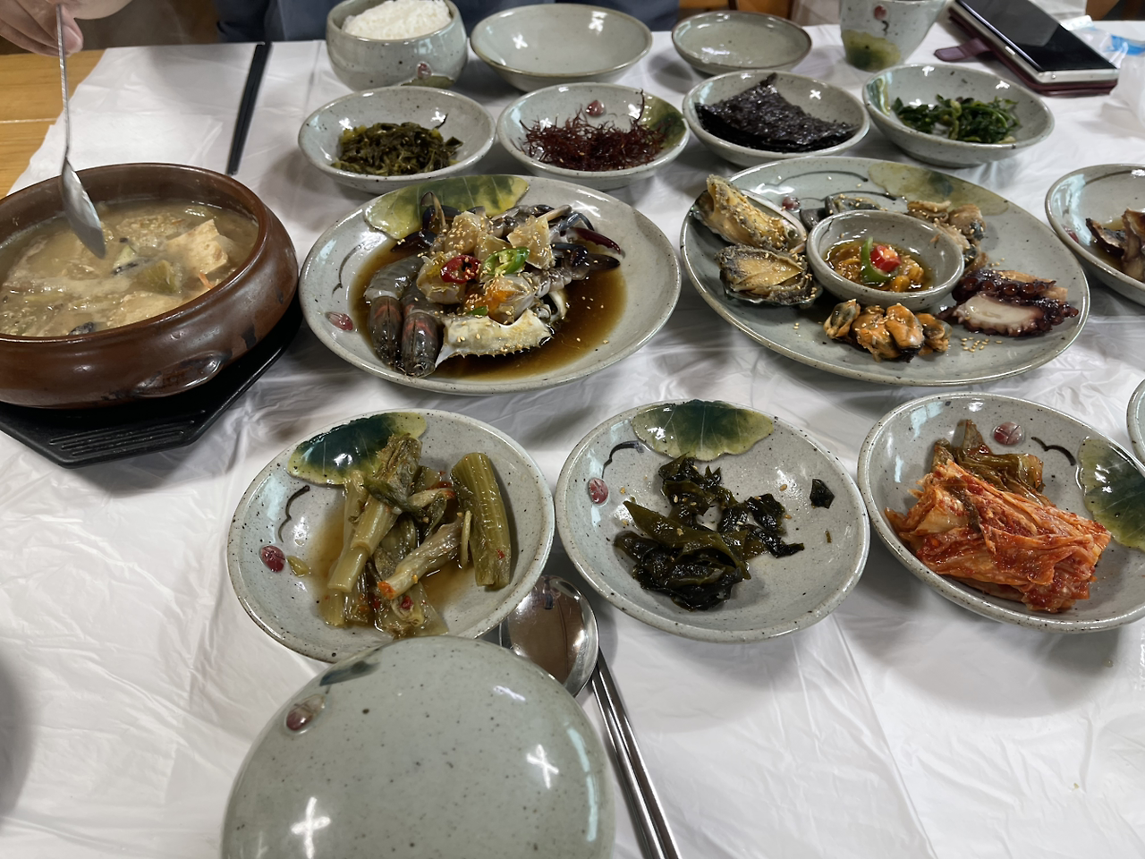 식당에 입장하니 삼삼오오 손님들로 꽉 차 있다. 생경하지만 특이한 메뉴 모듬장 정식을 주문한다. 이 메뉴는 전복, 문어 등 해산물을 간장에 절인 음식들이 메인으로 나온다. 생선구이도 구운 후 간장을 자작하게 부어준다. 된장찌개도 함께 온다.