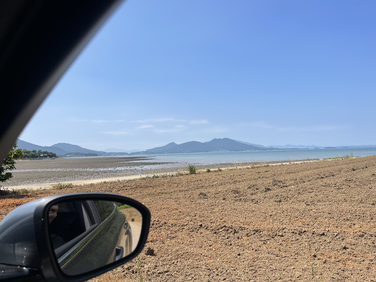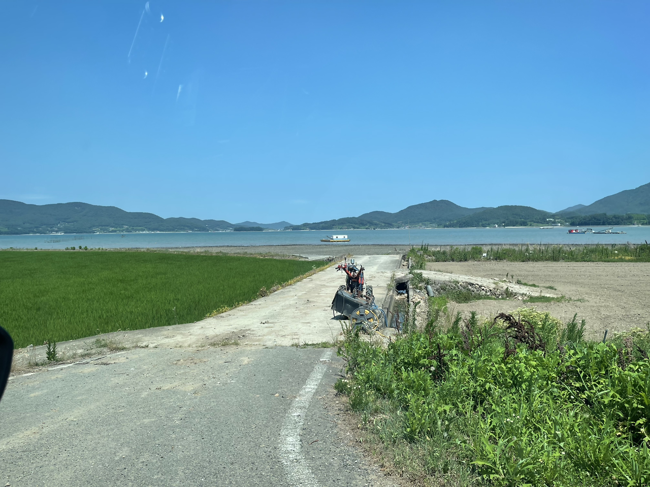 삼동읍을 떠나 다음 숙소가 있는 남면으로 이동한다. 이동 도중 해안도로라는 이정표를 보고 대로를 벗어나 그 길로 들어서 본다. 남해군의 동서 땅이 한눈에 들어오는 만을 지나게 된다. 뻘이 넓은 것이 서해안 바다가 같다. 이 길을 통해 동쪽 남해에서 서쪽 남해로 넘어간다.