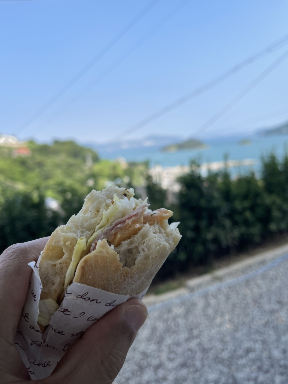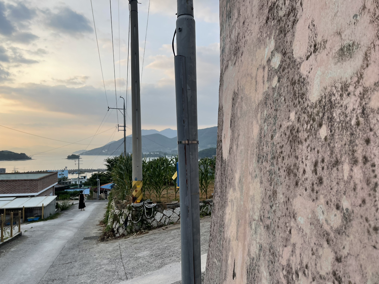 여수를 바라보며 서쪽 사면에 위치한 평산리는 오전에 그늘이 진다. 뒤쪽에서 바다를 향해 비추는 순광 방향 빛 때문에 오전의 모습이 압권이다. 너무도 평화롭고 아름다운 모습을 만끽하고자 마당에 앉아 샌드위치와 커피를 먹는다. 입에는 꿀맛, 눈에는 꿀경치다. 아. 힐링이란 이런 것인가 싶다. 식사 중에도 고양이 녀석들이 근처에서 잔망 거린다.
