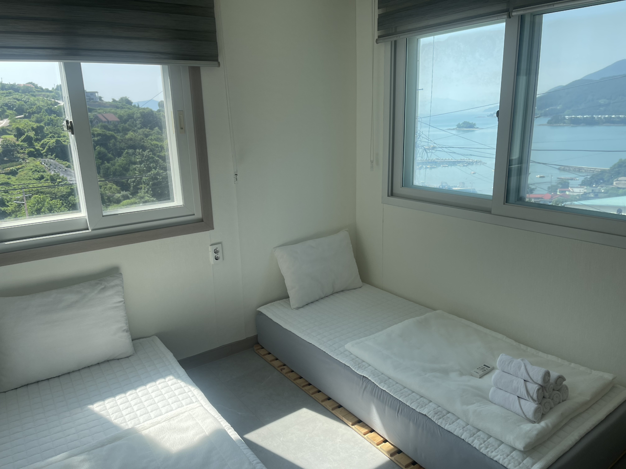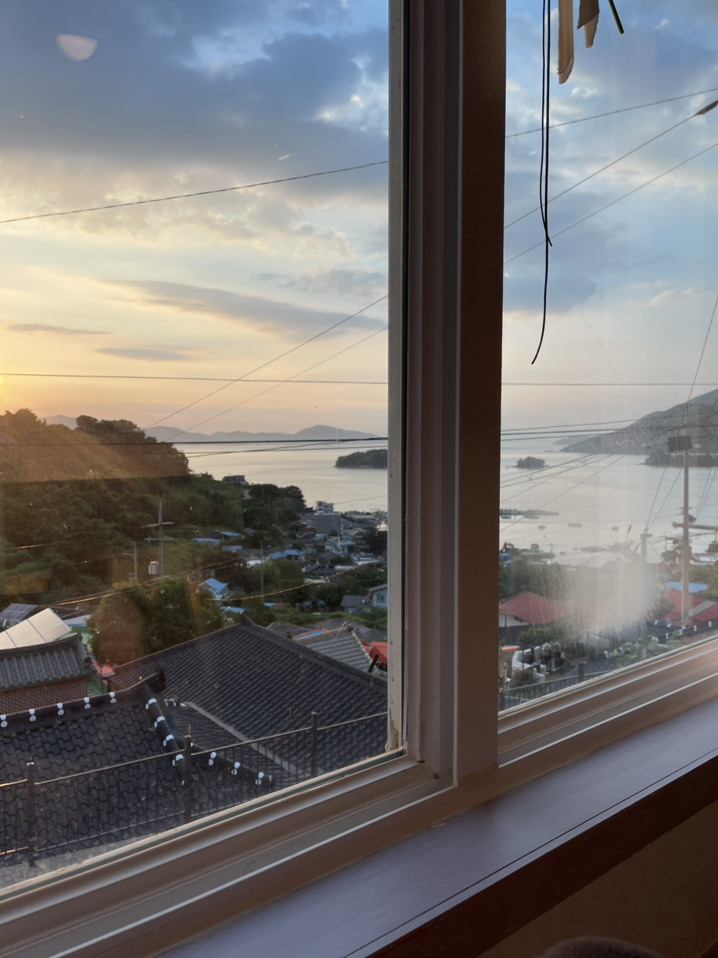 남해읍에서 남면에 들어서면 아난티 골프장을 지나 언덕을 올라오면 여수를 바라보며 멋지게 자리 잡은 평산마을이라는 곳에 게스트 하우스가 있다. 여기서 세 밤을 보낼 예정이다. 창밖으로 보이는 경치는 도시인들의 마음을 휘어잡기 충분하다. 바닥에 싱글 매트리스를 놓은 방은 좁은 듯 하지만 청결의 끝판왕이다. 너무 깨끗하고 잘 정돈되어 있다.