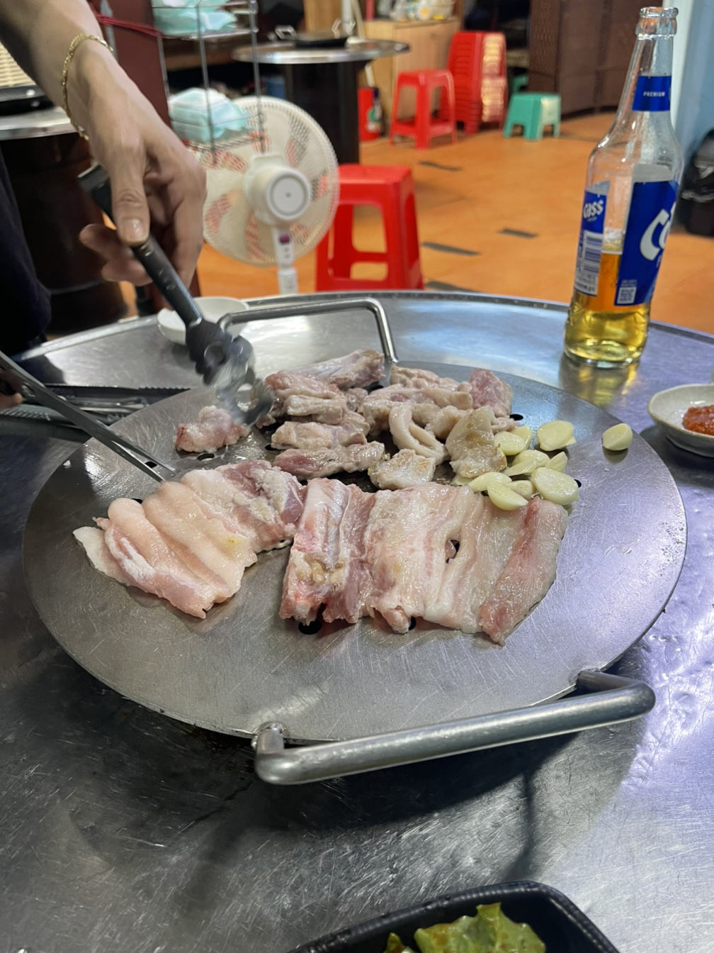 고기가 나왔다. 손님이 없으니 따님 사장님이 직접 구워주신다. 생고기 2인과 양념 1인을 주문했다. 3인분이 기본이다. 1인분에 만원이니 2인이 와서 3만 원 주문이니 1인분 1만 5천 원 되겠다.