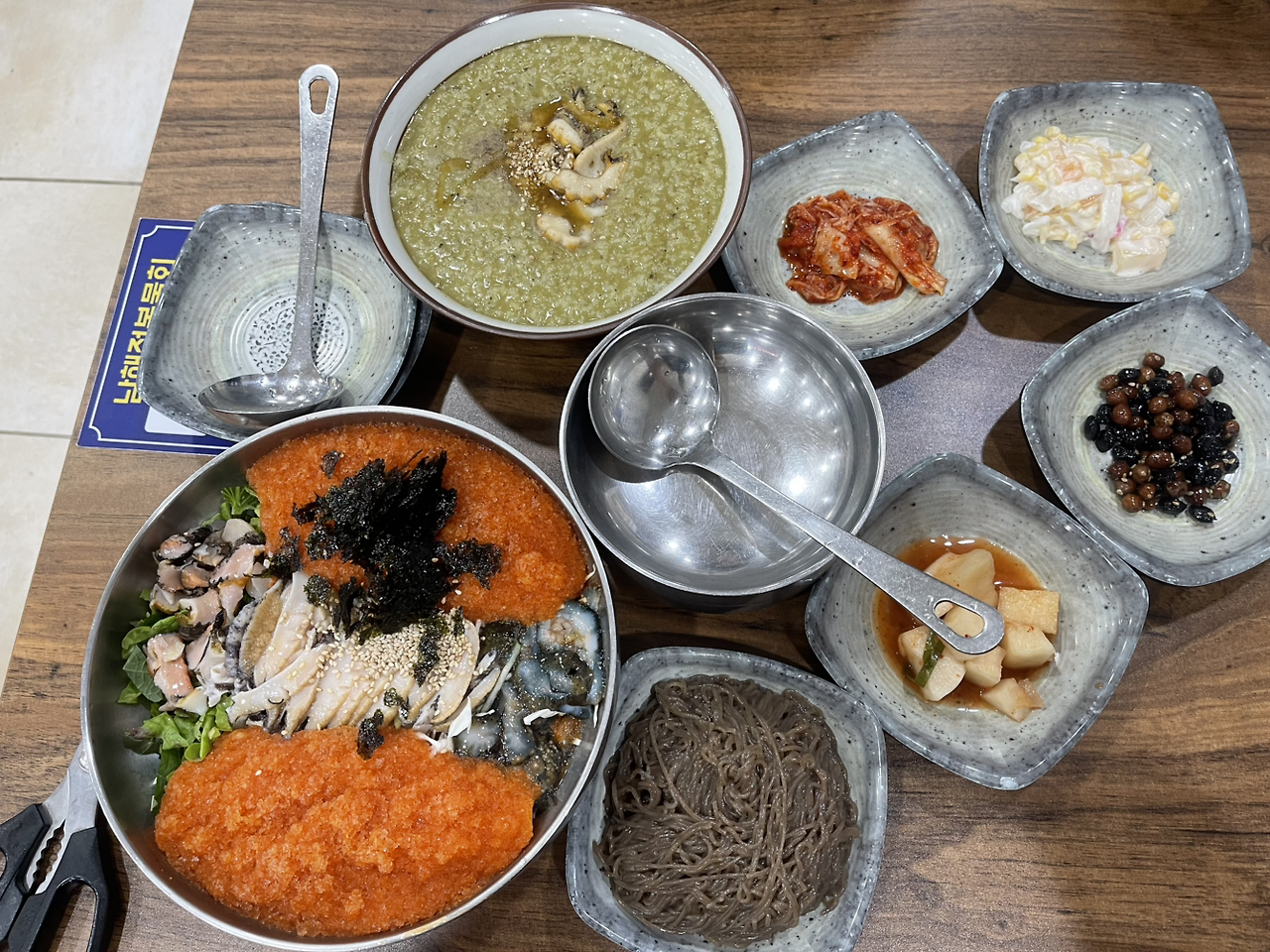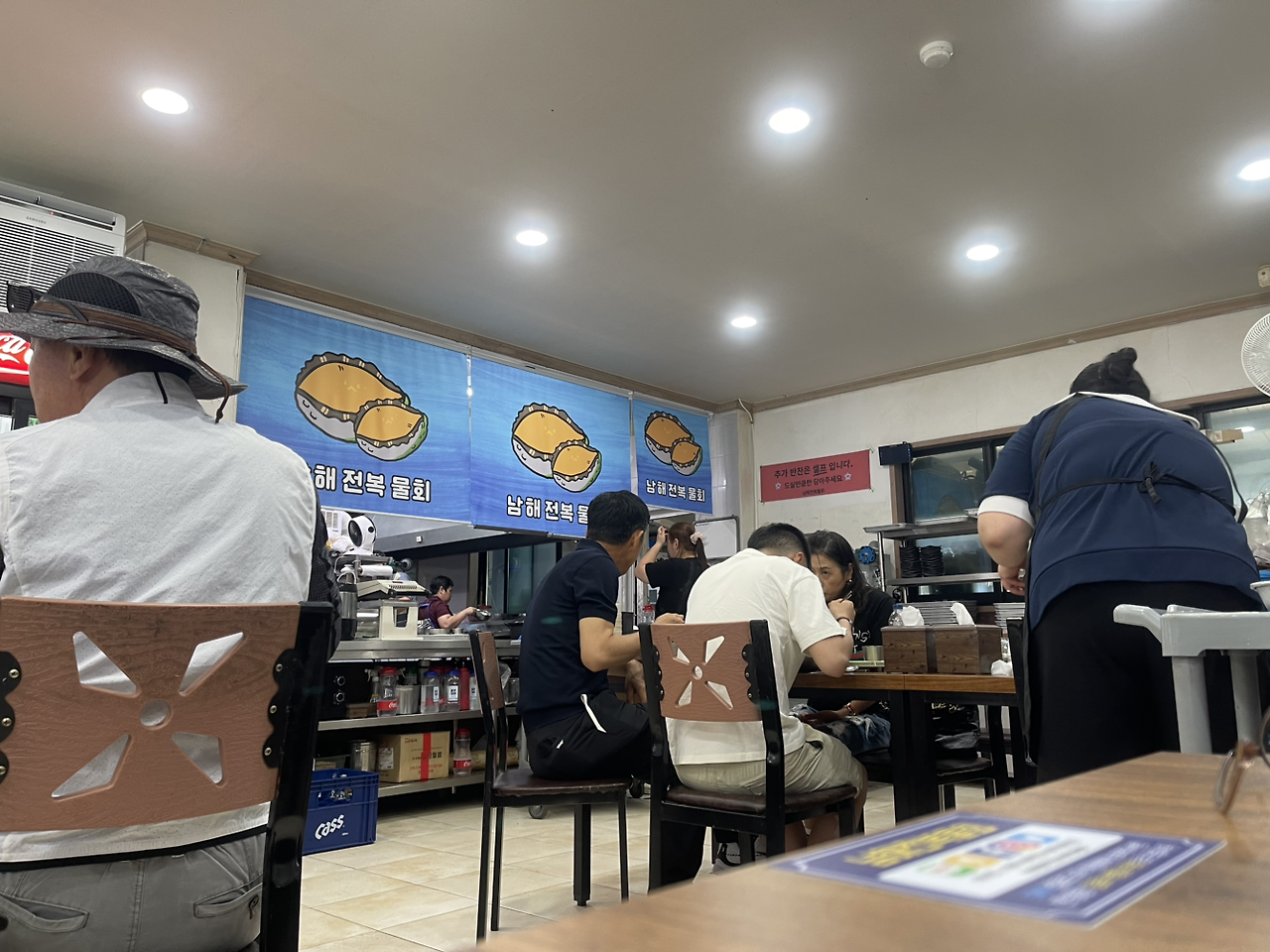 주차장에 차가 꽉 차있는 로컬 맛집이다. 가게 앞에 큰 대기판이 있다. 문을 여니 손님들로 꽉 차 있다. 운이 좋아 빈 테이블에 앉을 수 있다. 메뉴 중 장어국이 있길래 먹고 싶었으나 겨울메뉴란다. 하는 수 없이 전복죽과 전복 물회를 주문한다.