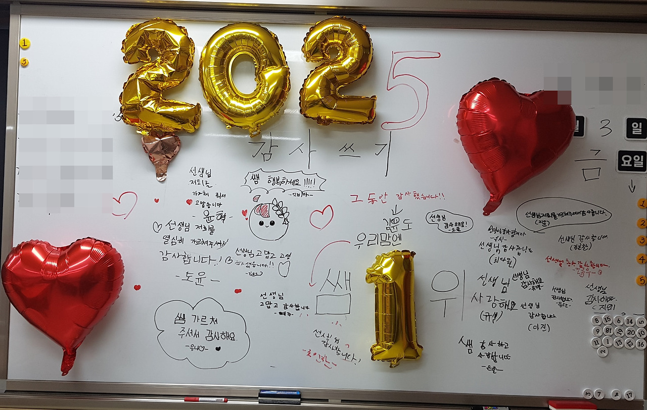 사실 어제 아침에도 헤어질 선생님을 위해 몇 아이가 이른 시각에 등교해서 칠판을 꾸며놓고 선생님을 놀라게 해준다며 어두운 교실에서 숨어 기다리고 있었다. 그래서 오늘은 더 많은 아이들이 올 걸 예상해서 서둘렀던 건데 가는 날이 장날이 되어버린 셈이다.