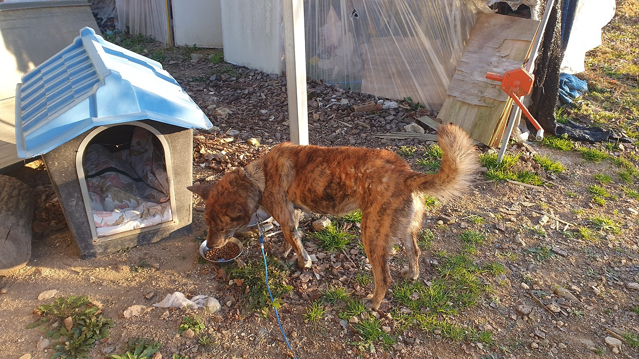 자리를 잡아주고 입마개를 풀어준 다음 먹이와 물을 갖다주자 입마개를 쓰고 얼마나 짖어댔는지 이빨에 피가 나 있다. 남편이 다가가서 쓰다듬어주려는데 거부하며 먹이도 거들떠보지 않는다. 한 시간 후 다시 나간 남편이 호돌이가 먹이를 다 먹었다며 다시 갖다주었다고 한다.
