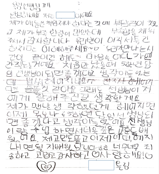 "선생님, 오늘이 마지막이네요. 다음 주는 어느 학교로 가세요? 우리 5학년 때 담임 해주시면 안돼요? 담임 해주세요!"