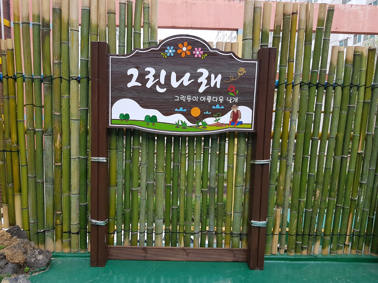그린나래. 오며가며 수시로 창밖을 내다보고 정원의 이름이 참 예쁘다고 생각했었다. 가까이 가서 예쁘게 꾸며진 팻말을 보니 큰 글씨의 '그린나래' 밑에 작은 글씨로 풀이를 해두었다.