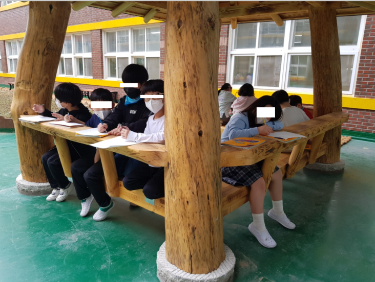 밑그림만 그려놓고 어떤 색을 칠할 것인지 결정이 되었다면 놀아도 된다고 하자 한정된 공간에서 그리고 수업 중 양 옆 교실 방해가 될까봐 앉아서 이야기를 하는 모습들이 눈에 띈다.