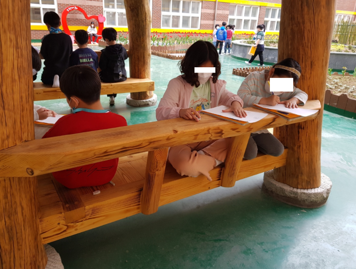 8절 도화지를 나누어주고 아이들과 함께 '그린나래' 정원으로 들어섰다. 창밖으로만 보았던 정원의 모습과는 달리 2층의 아늑한 정원이 우리 아이들에게는 힐링의 장소가 될 것 같다는 생각이 들었다.