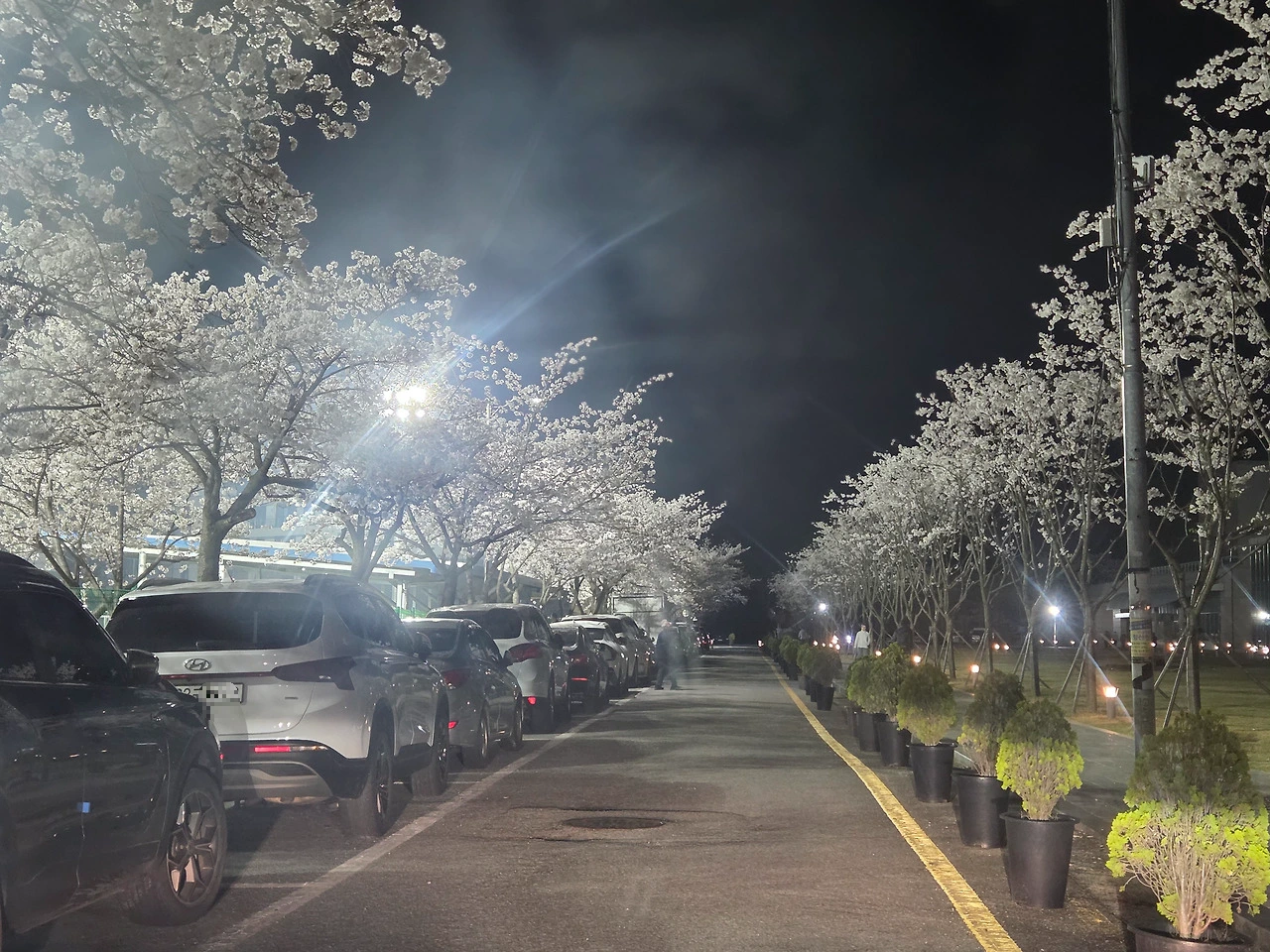 남편 말대로 야간 벚꽃이 더 멋있다는 말이 실감났다. 어둑발이 지고 나서 삼삼오오 가족과 함께 오거나 지인들과 함께 온 인파가 늘어났고 불빛으로 인해 반사되어 반짝거리는 벚꽃들을 찍느라 예제서 고개를 뒤로 젖히고 사진을 찍는 사람들의 모습도 장관이었다.