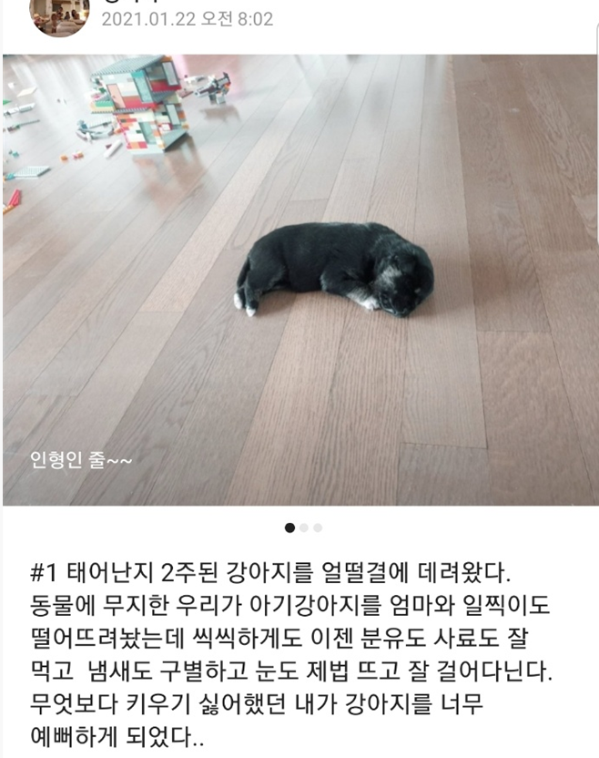 눈도 뜨지 않은 새끼가 염려되었으나 딸은 동물병원에 가서 사유를 말하고 코아에게 먹일 수 있는 분유를 사다가 먹이며 온갖 정성을 기울였다. 지우가 원했던 일이니 책임을 주고 키우게 했으나 아무래도 딸의 손길이 많이 갈 수 밖에 없었다며 코아를 키우는 동안 애완견 키우는 것을 적극적으로 반대했던 딸이 오히려 코아와 정이 많이 들었단다.
