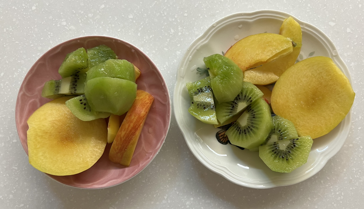 무생채가 있으니 무생채 비빔밥을 만들었다. 뜨거운 기온이 계속되니 싱싱한 배추를 구하기는 쉽지 않지만, 채소가게에 가면 상태가 좋은 무는 구할 수 있다. 어제 만들어 둔 순한 맛의 무생채로 무생채 비빔밥을 만들었다. 들어가는 재료가 워낙 간단하고 쉽게 만드는 음식이라 아이들이 맛없다고 할까 봐 걱정했는데, 아주 맛있게 잘 먹는다. 밥에 고추장과 참기름 조금, 무생채 넉넉히, 그리고 냉장고에 있는 아무 나물이나 넣으면 되는데 마침 가지 양파 볶음이 있어서 넣었다. 아이들 먹을 채소는 잘게 잘라서 비비고, 달걀 프라이를 올려주니 좋아한다. 무생채의 아삭아삭한 식감을 좋아라 한다. 얼마 전에 만든 얼갈이겉절이 비빔밥 보다 인기가 더 좋다. 내가 먹을 비빔밥은 현미밥 위에 참기를 살짝 두르고 무생채만 잔뜩 올려서 덮밥처럼 먹었다. 방울토마토를 곁들이니 무의 알싸한 향이 중화된다. 간식으로는 멜론, 키위와 복숭아를 먹었다. 복숭아는 이제 끝물이라 맛이 싱겁고 신맛이 너무 강하다.