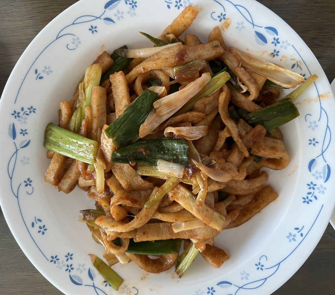 명색이 오늘은 인사를 하러 간 게 아니고, 음식 만드는 걸 도우러 간 거라 가족들은 같이 가지 않아서, 가족들 반찬을 미리 만들어 두고 나갔다. 오늘의 반찬은 감자채볶음과 어묵볶음, 그리고 로메인샐러드였다. 로메인은 잘 씻어서 손으로 적당한 크기로 찢었다. 로메인을 접시에 담고 위에 생들기름, 소금, 후추를 조금씩 뿌렸다. 감자채볶음은 감자 네 개를 가늘게 채 썰어 소금에 절이고, 10분 뒤에 찬물에 헹군 다음 꽉 짜서, 양파 1개와 함께 볶아서 완성했다. 간은 소금과 후추로 하고, 한쪽에는 치즈를 녹여 주었다. 어묵볶음은 파 두 뿌리의 배를 가른 다음 길쭉하게 잘라서 어묵과 같이 볶았다. 어묵에서 기름이 나오니 처음에는 그냥 볶다가, 거의 볶아질 무렵 식용유, 고추장, 간장, 설탕, 올리고당 1큰술씩 넣고 한 번 더 볶았다.