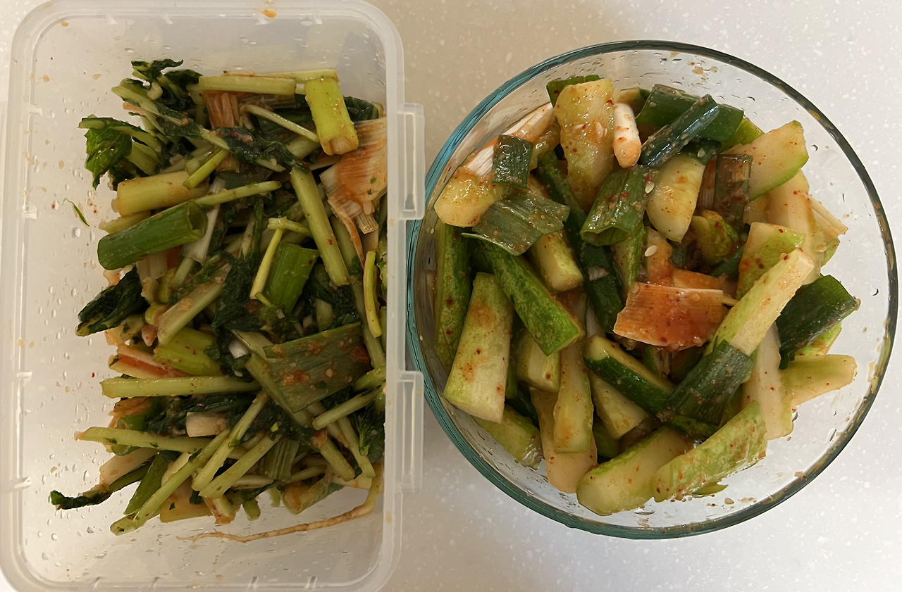 김치를 세 가지나 담근 날이다. 자주 이용하는 친환경 생협에 갔다가 채소를 이것저것 사 왔다. 열무가 딱 한 봉지 남았기에 장바구니에 담고, 오이가 떨이로 엄청 싸게 팔기에 또 한 봉지 담고, 중파도 좋아 보여서 장바구니에 담았다. 집에 와보니 물품들이 벌써 집 앞에 도착해 있다. 채소들을 냉장고에 넣지 않고 선반에 꺼내어 두고 손질을 시작했다. 보통은 냉장고에 쟁여 두었다가 상하기 전에 부랴부랴 손질하거나, 먹고 싶어지면 조금씩 만드는데, 오늘 사온 떨이 오이는 바로 손질하지 않으면 못 먹고 버릴 것 같다. 그래서 오이김치를 담그는 김에 열무김치까지 담갔다. 양념은 밥 2, 고춧가루 3, 냉동 다진 마늘 2, 매실청 2, (마스코바도) 설탕 2, 멸치액젓 1, 굵은소금 1큰술을 핸디믹서로 곱게 갈았다. 별생각 없이, 거의 자동적으로 이것저것 섞어서 갈았는데 간을 보니 너무 짜다. 게다가 보통 겉절이를 할 때에는 (풀 대용품인) 밥을 넣을 필요가 없는데 밥까지 넣어 버려서 걸쭉하다. 멸치액젓이 똑 떨어져서 굵은소금을 추가했더니 평소의 맛이 아니다. 어쩔 수 없이 양념을 조금만 사용하기로 마음먹었다. 간단한 양념으로 버무린 겉절이를 좋아하는데, 오늘의 양념 맛은 묵직하다.