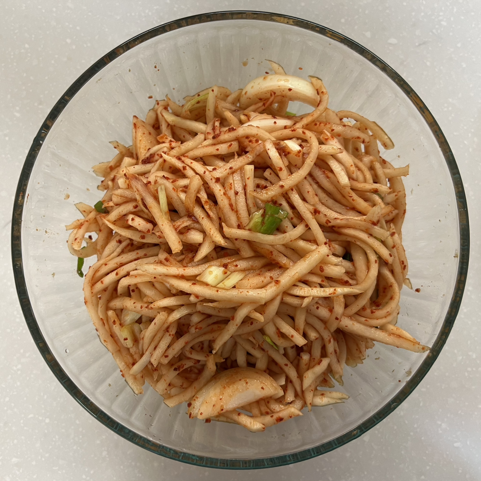 무생채는 만들기 쉬운 자연식물식 반찬이다. 자연식물식을 시작하기 전부터도 가장 쉬운 김치로 무생채를 자주 만들곤 했다. 김치가 떨어졌는데, 배추김치는 엄두도 나지 않을 때도 무생채는 뚝딱 담글 수 있다. 냉장고에 며칠 째 서랍 한 칸을 차지하고 있는 무 한 개를 꺼냈다. 무를 깨끗이 씻고 필러로 껍질을 벗겨냈다. 무가 너무 커서 삼등분을 한 뒤에 굵은 채칼로 채를 쳤다. 채친 무는 소금 세 큰 술에 잠깐 절여 두면 된다. 잠깐만 절였다가 바로 헹구어 내고 양념에 무치면 되는데, 무를 절이는 동안 다른 반찬을 만드느라 무가 너무 절여졌다. 만들어 둔 양념의 절반밖에 넣지 않았지만 무가 너무 짜게 절여진 바람에 짠맛이 가시질 않는다. 김치는 물이 빠지면서 싱거워지니 싱거워지길 기다리거나, 무생채를 넣고 비빔밥이나 해 먹어야겠다. 물론 무생채가 짜니 고추장은 적게 넣고 밥을 비비는 게 좋겠다. 무생채의 양념은 멸치액젓, 고춧가루, 다진 마늘, 설탕, 식초를 2:1:1:1:1의 비율로 섞었다. 무와 양념을 잘 버무린 다음, 파와 양파도 적당한 크기로 잘라서 살살 섞었다. 매실청을 넣어도 좋다.