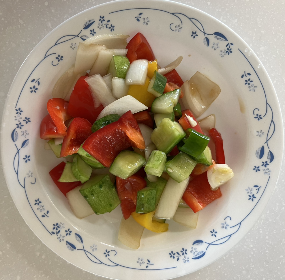 오이를 길게 4등분 한 뒤에 한입 크기로 잘랐다. 양파도 비슷한 크기로 자른 다음, 오이와 양파를 소금 한 큰 술에 절였다. 잠깐 절여지는 동안 아삭이고추 4개를 비슷한 크기로 자르고 파프리카도 한입 크기로 자른 다음, 채소를 다 섞어놓고 보니 색이 참 골고루 예쁘다. 여기에 고춧가루를 넣고 무치면 색감이 묻힐 것 같아서, 고춧가루는 넣지 않았다. 소금에 절인 오이와 양파를 씻어내지 않고 간장 3, 설탕 2, 식초 2큰술을 넣고 무쳤다. 오이겉절이에서 고춧가루만 뺐을 뿐인데, 맛의 차아기 확연하다. 역시 고춧가루를 넣지 않고 무치기를 잘 했다. 고춧가루를 넣은 채소 반찬은 이미 몇 가지나 있으니 아삭한 채소무침은 고춧가루 없이 담담하게 무쳐도 김치가 아쉽지는 않다. 먹다 보니 색이 다채롭고 예뻐서 눈이 즐겁고 아삭거리는 싱그러운 식감도 좋고 새콤달콤한 맛도 일품이다. 넉넉히 무쳐 두었으니 며칠 동안 샐러드를 대신할 자연식물식 반찬으로 족하다.