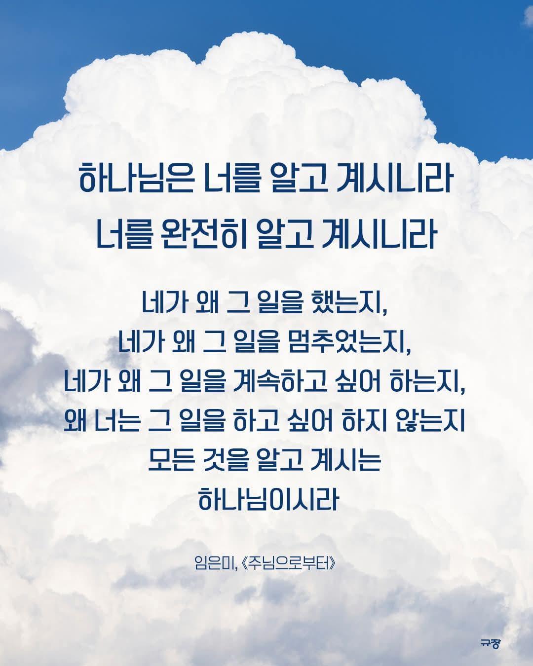 그저 하루하루 최고의 날로 여기며 소중함이 무엇인지, 감사가 무엇인지를 알아가고 있다. 임은미 선교사님은 아주 오랜 시간 매일 묵상을 하며 그 묵상을 많은 사람들에게 보내주고 있다. 그 묵상 안에는 하나님이 하나님 되심과 우리 안에 해결하지 못한 여러 가지 문제와 상황을 어떻게 해결하고 어떻게 그 환경을 제대로 보아야 하는지를 매일 알려 주신다. 나는 그 말씀을 통하여 깨달음과 축복을 매일 누리며 살고 있다. 그 묵상 속에 보이는 하나님을 나는 매일 만나고 있다. 잘 살아야지, 나누며 살아야지 매일 감사해야지 감사하는 것만큼 큰 축복은 없다. 나는 알고 계시는 하나님은 나의 모든 것을 다 알고 계시고 완전한 계획 속에 나를 살게 하신다.