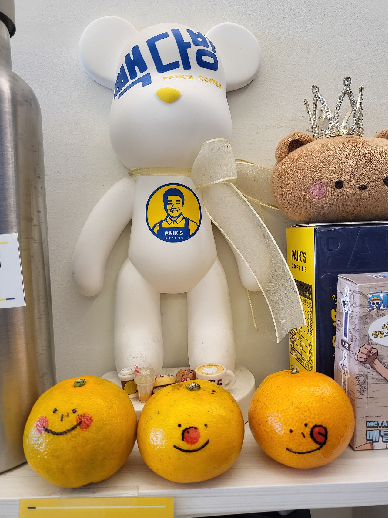 겨울이 되면 매니저는 귤에 작은 그림을 그려 카운터 위에 쭈르륵 세워 손님의 마음을 행복하게 해 준다. 그걸 보는 순간, 모두의 얼굴에 웃음이 가득했다. 누군가의 하루를 밝히려고 애쓴 흔적은 한 손에 커피, 한 손에 그날의 행복 한 조각을 가져온다.