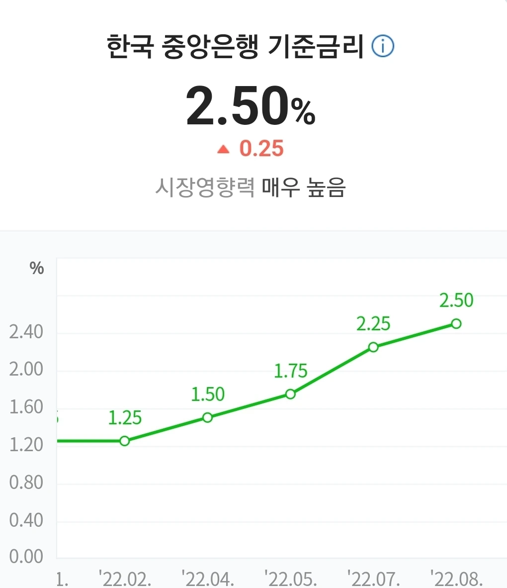 한국의 기준 금리가 계속 올라 현재 2.5%가 되었다. 이 수치는 2013년 5월 이후로 9년 만이다.