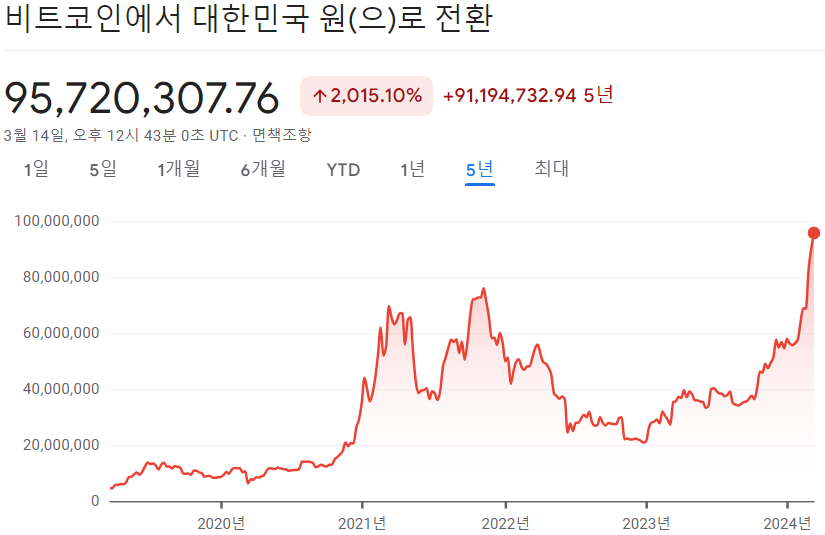 비트코인 5년 지수(구글 금융)나스닥 지수가 2배가 되었던 5년이라는 기간 동안 비트코인은 무려 20배가 상승했다.