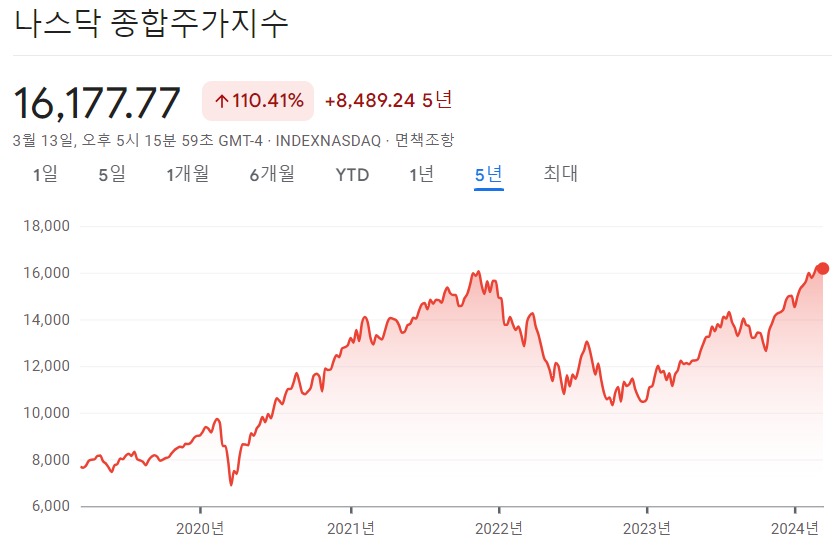 나스닥 5년 지수(구글금융)위의 차트와 같이 나스닥 전체 지수가 5년 전에 비해 2배 이상 상승했다.