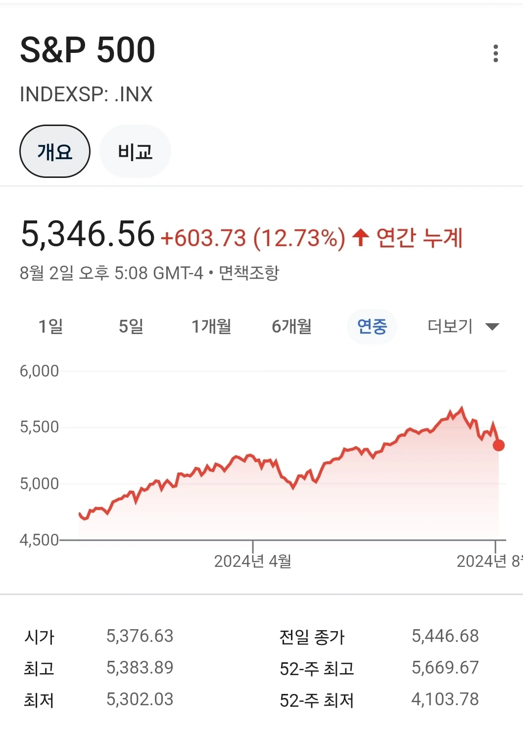24년도 S&P 500 지수변화그래프에서 알 수 있는 팩트는 미국 S&P 500 지수는 올초 대비 12% 이상 상승했다는 것이다.