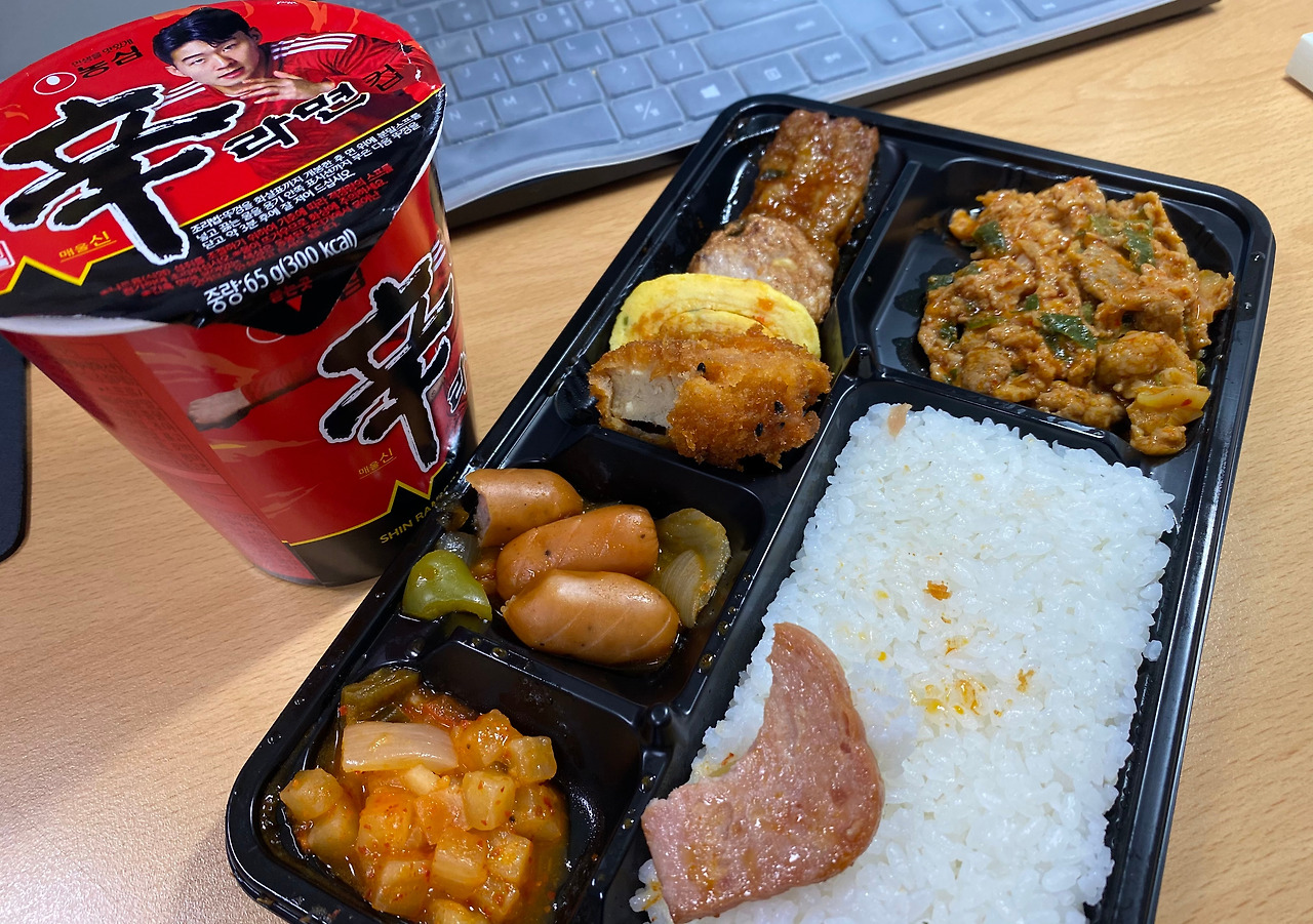 누가 보면 야근하려고 먹나 싶을 테지만, 다른 그 어느 때보다 오늘이야말로 편의점 도시락 까기에 아주 적기인 날이었다. 오늘은 같은 사무실을 공유하는 동료분들도 출장이셨고 주변 사무실을 사용하시는 분들도 계시지 않았다. 마치 금요일 같은 수요일이었기 때문에 더욱 치밀하게 먹을 수 있었다. 평소에는 가공식품과 고기류는 먹지 않지만, 가끔씩 미디어에서 보였던 회사원의 야식 메뉴에 대한 로망이 치솟을 때엔 건강보단 로망을 우선시해버린다. 그대로이지 않으면 잘 느껴지지 않는 간접체험이기 때문이다.