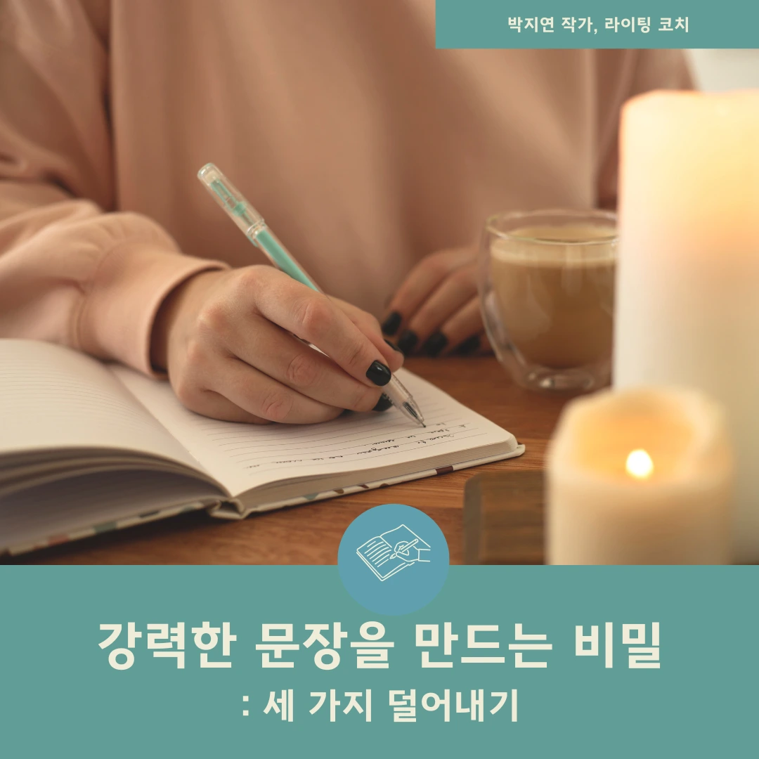 위에서 언급한 세 가지만 덜어내도 글은 힘을 얻습니다. 처음에는 어색할 수 있지만 의식적으로 연습하면 간결하고 정확한 문장을 쓸 수 있습니다.