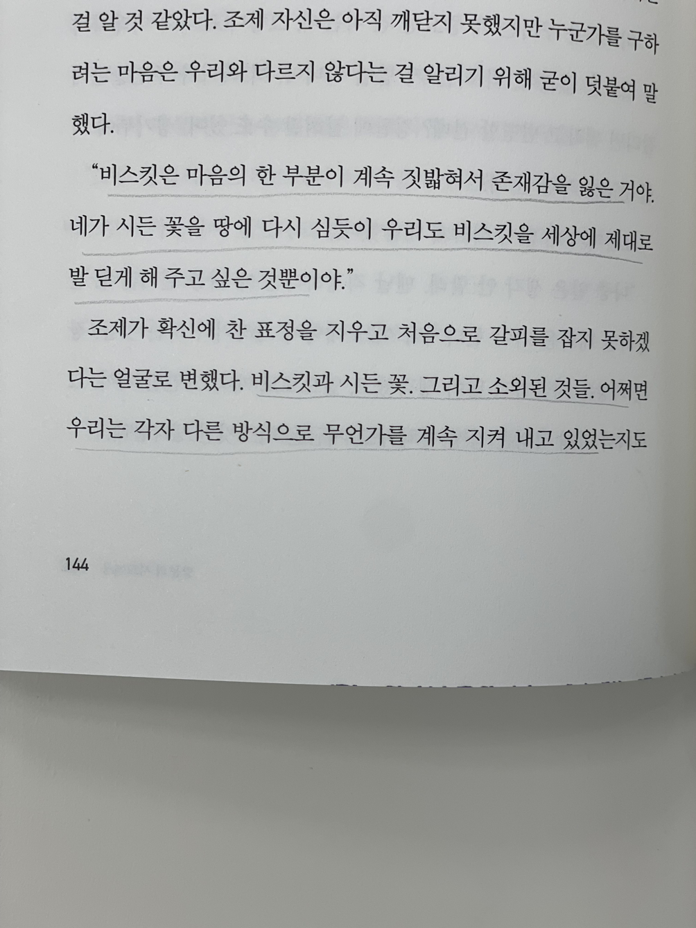 에필로그에서 작가는 말합니다. 비스킷은 자신을 소외시키는 주변에 의해 처음 만들어진다고요. 저는 그럴 수 도 있고 아닐 수도 있다고 생각합니다. 이 책에 나오는 조제(이지안), 희원(꼬마), 도주와 효진(제성이 친구) 이처럼 자신을 소외시킨 가정이나 사회집단으로부터 만들어지기도 하지만, 요즘처럼 과잉보호를 받는 시대에는 스스로 비스킷이 되려 하는 이들도 있다고 봐요. 요즘은 독립심이 없는 아이들이 많다고 합니다. 스스로 할 수 있는 게 없다고도 하고요. 선택이나 결정할 기회를 주지 않기 때문에 그런 게 아닐까요. 그들에게 오는 지나친 관심과 간섭으로부터 벗어나려 비스킷이 되려 하지 않을까 싶어요.