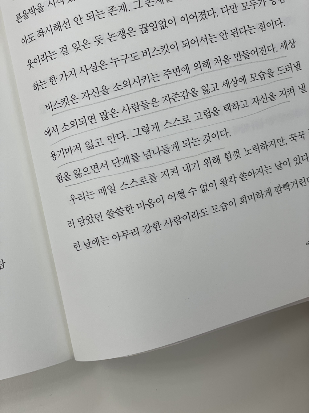 어릴 때는 어른만 되면 모든 일을 척척해낼 수 있을 거라고 생각했습니다. 어른들의 세계에는 실패도, 험담도, 왕따도 없을 거고요. 그런데 아니었습니다. 자아가 형성된 어른들의 세계가 더 끔찍했습니다. 작은 모임에도, 가정에도, 직장에도 김선미 작가가 말하는 비스킷은 있었습니다. 간혹, 비스킷 같은 존재가 되길 자처하는 사람도 있었고요. 저도 직장 생활이나 인간관계에서 슬럼프가 올 때면 비스킷이 되고 싶었습니다. 눈에 띄지 않는 존재로 내가 할 일에만 집중해야지 하고요. 그렇다고 존재감이 없어지길 바라는 건 아니지만, 눈에 띄지 않았으면 할 때가 지금도 더러 있어요.