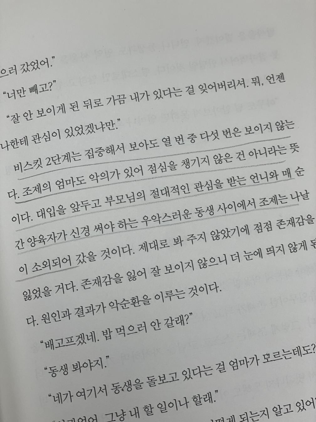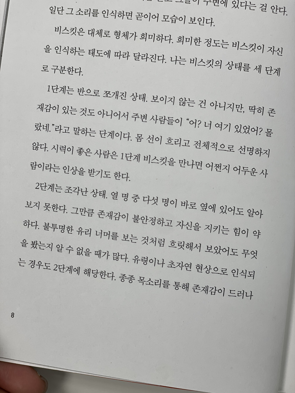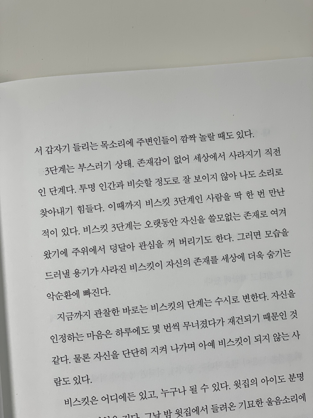 비스킷은 대체로 형체가 희미하다고 합니다. 존재감이 없다고 표현하기도 하죠. 프롤로그에서 비스킷을 단계별로 나눈 걸 보면서, 나는 어디에 속한 적이 있는지, 내 아이는 어떠한지 살펴보게 되더라고요. 이 책을 읽은 저녁에, 베테랑 2 영화를 보고 왔어요. 거기에 황정민 아들로 나오는 배우가 생각났습니다. 집에서는 2단계지만, 학교에서는 3단계일 수도 있겠다면서요. 이 책과 영화가 겹쳐 더 혼란스럽기도 했고요.