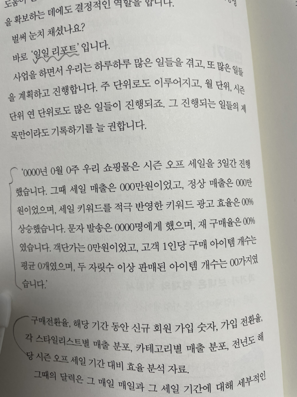 매일 '일일 리포트'를 쓴다고 가정해 봅시다. 세세한 기록이 분석할 수 있는 데이터가 됩니다. 저자도 말했지만 역사가 반복되듯, 사업에서도 일정 패턴이 있을 겁니다. 그것을 읽어내는 기초에 세세한 리포트가 있는 거죠.
