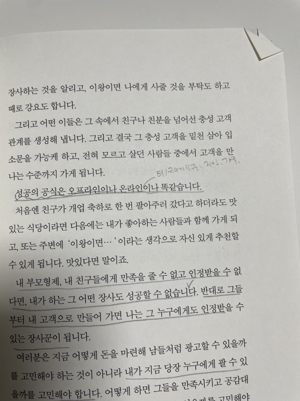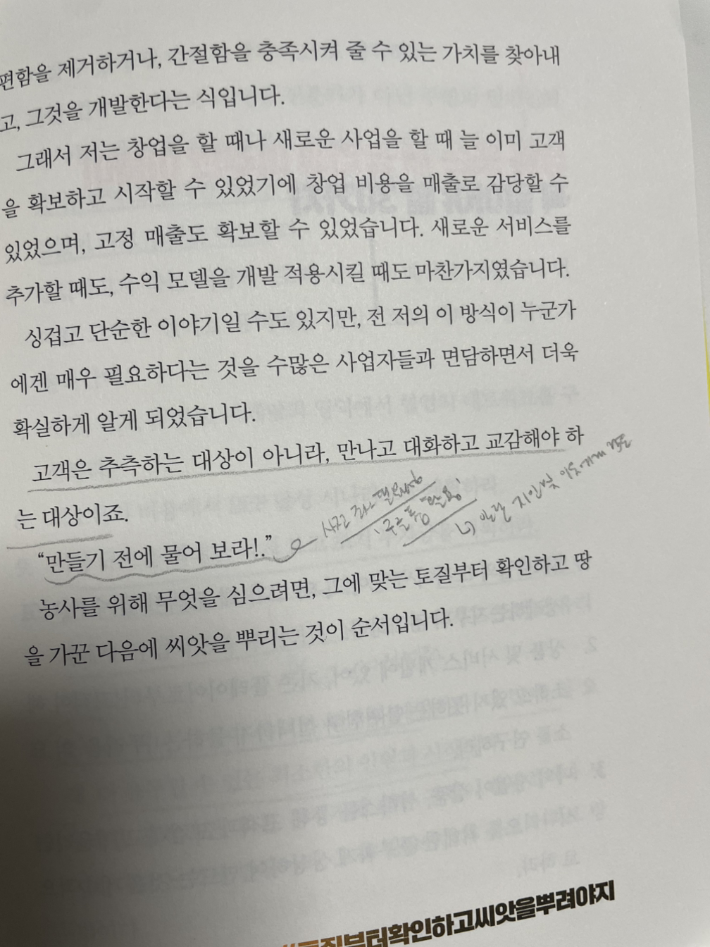 이 책은 단순한 경영 지침서가 아닌, 실천 가능한 행동 지침을 제시합니다. 특히 '만들기 전에 물어보라'는 조언은, 오늘 당장 실행할 과제가 되기도 했습니다. 이 책은 한 달 뒤에, 6개월 뒤에, 일 년 뒤에 읽어도 큰 도움이 될 겁니다. 1인 기업으로서 브랜드 가치를 높이고, 진정성 있는 서비스를 제공하기 위한 구체적인 로드맵을 그릴 수 있게 해 줘서 감사합니다.