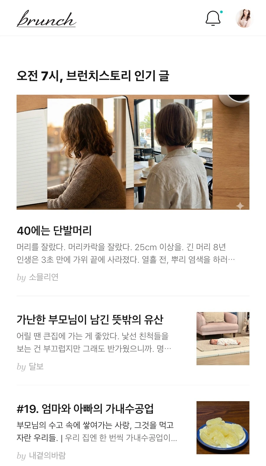 수요일 저녁, <40에는 단발머리>라는 제목으로 에세이를 블로그와 브런치에 올렸다. 다음 날 오후부터, 계속 브런치에서 알람이 울렸다. 이웃들이 이렇게 열심히 글을 쓴다고? 종그림을 눌렀다. 24시간 만에 조회수 1000이 넘었다. 다음 날 오후부터 꾸준히 달리던 글은 금세 4,000을 찍고 5,000을 찍었다. 자정까지 얼마나 올라가나 지켜봤다. 6,000을 넘기고 한 시간 뒤, 밤 11시에는 7,000을 찍었다. 누가 이 글을 보는 걸까. 유출이나 공유는 아닐 테고, 브런치 홈 메인에 뜬 건가. 브런치 앱을 열고 메인화면으로 들어갔다. 엄지손가락을 아래에서 위로 올렸다. 대여섯 번쯤 올렸을까. '오후 10시, 브런치 스토리 인기 글'에 내 글이 있었다. 대체 이 상태로 몇 시간이나 있었을까. 오후 11시에도, 자정에도 그대로였다. 그리고 오늘 아침 7시, 8시에도 그랬다. 그리 대단한 글도 아닌데, 왜 이러지. 댓글은 없는데 조회수와 좋아요만 많아지는 상황. 조회 수는 1만을 넘겼다. 제목은 40에는 단발머리지만, 실제로는 44이다. 아니, 42인가? 아직도 헷갈리는 새 나이. 누가 댓글로 '마흔 아니고, 마흔네 살이잖아요!'라고 할까 봐 혼자 움찔.