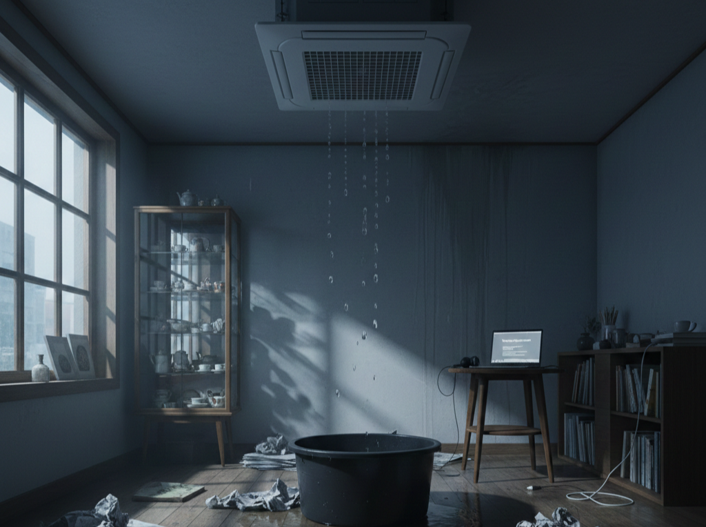 물은 천장형 냉온풍기 아래에서 떨어지고 있었다. 한 방울, 두 방울. 금세 속도가 가팔라졌다. 아이스버킷 챌린지 할 때 쓰는 것 같은 커다란 양동이를 그 밑에 받쳤다. 공방 계약할 때 밀대 세탁용으로 사 두었던 검정 플라스틱 통. 이런 날, 이런 용도로 처음 쓰게 될 줄이야.