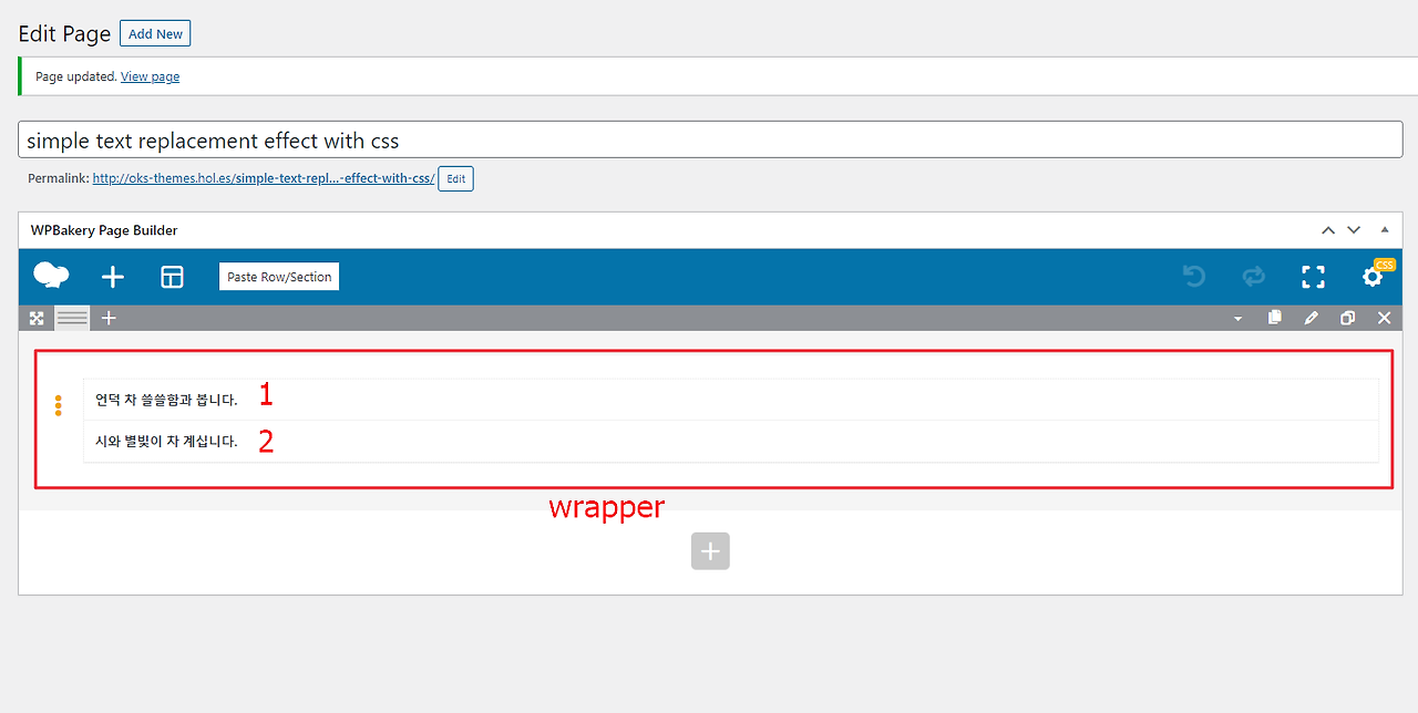 웹 화면에 표시될 텍스트들을 우선 원하는 곳에 놓습니다. 저는 Impreza 테마의 페이지 빌더를 써서 테스트용 페이지에 이렇게 구성을 했습니다.