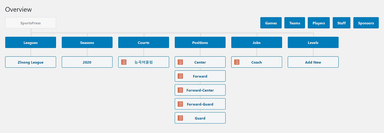 워드프레스의 포스트 타입을 토대로 이 플러그인 개발자들은 아래와 같은 연결 고리들을 만들어 놨습니다. 전체 리그나, 팀, 선수, 시즌을 한눈에 파악하면서 세팅을 할 수 있습니다.
