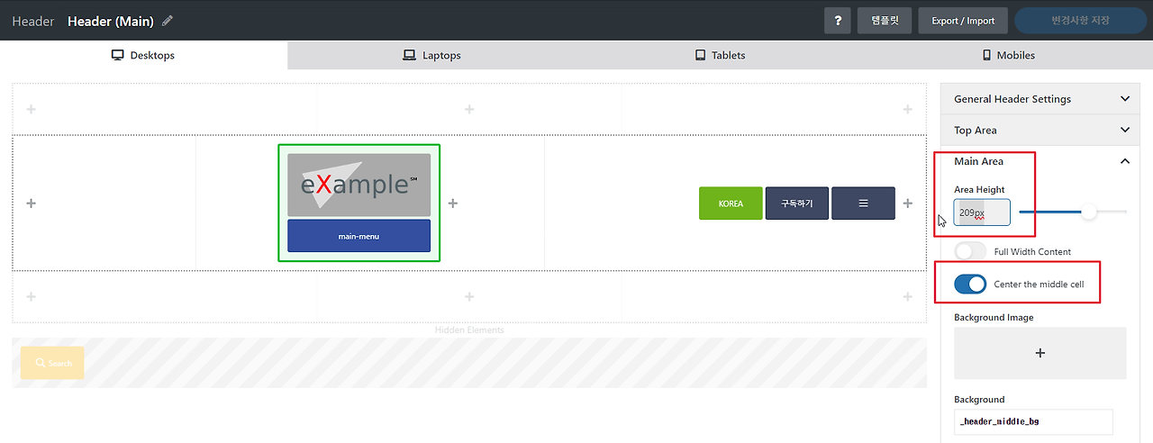 헤더 구성이 완료됐다면, 만들어진 헤더는 테마 옵션의 Layout 설정들에서 연결해 줘야 표시가 됩니다.