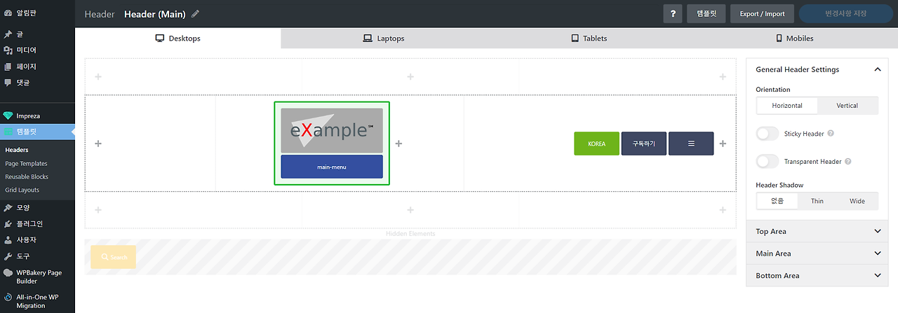 Impreza 테마는 헤더 빌더를 제공합니다. 그래서 원하는 대로 디자인에 맞게 헤더를 구성할 수 있습니다.