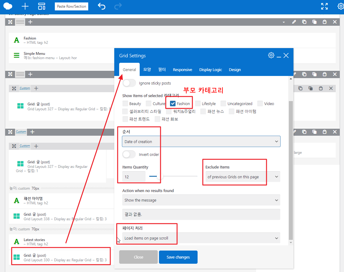 맨 마지막의 그리드만 추가 설명을 하면, 이 페이지는 패션(Fashion)이라는 큰 주제 아래의 모든 글들을 표시하는 곳입니다. 그래서 처음엔 최신글 12개를 불러와서 표시를 하고, 스크롤을 내릴 때 12개씩 더 붙는 방식으로 구성을 하게 되는데, 이때 분류를 최상단 부모 카테고리를 선택하면 되고, 만약 위쪽에 표시했던 글과 중복되지 않는 글들만 표시하고 싶다면, 'Exclude items'라는 옵션을 통해서 최신 글 리스트에서는 표시가 안 되게 할 수도 있습니다. (! 이걸 개발로 구현을 하려면 꽤 복잡합니다.)