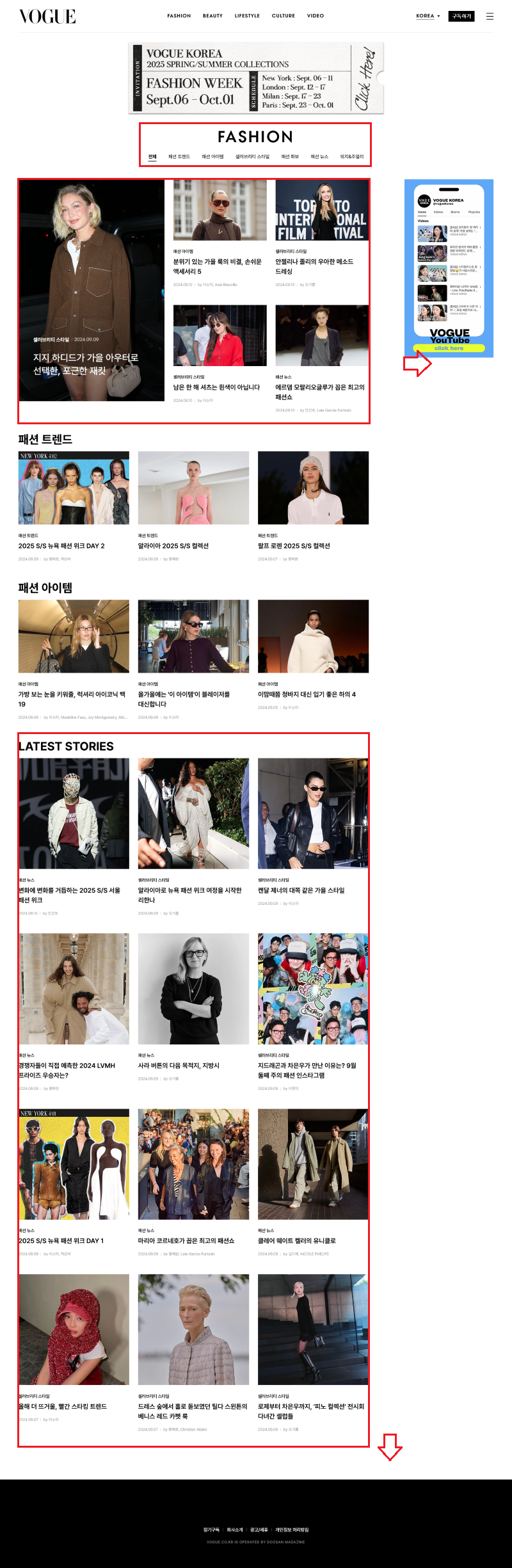 참고 사이트의 콘텐츠들은 헤더에 있는 내비게이션 메뉴들과 같이 총 5가지로 나뉘어 있습니다. 메뉴 중 하나(예:Fashion)를 클릭하면 그 주제의 모든 글을 조금씩 모아 보여주는 페이지가 나오게 됩니다. 타이틀 아래에는 큰 주제 안의 세부 카테고리 링크들이 표시가 되어 한 번 더 원하는 분류의 글들만 모아보기가 가능하도록 해 놓았습니다.