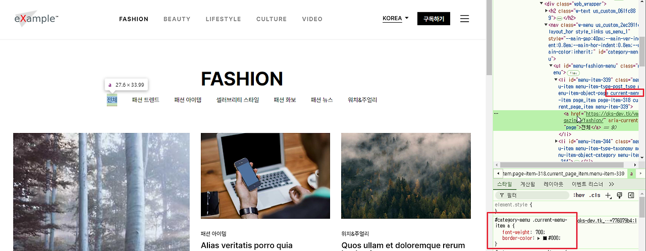 그래서 현재 열린 페이지와 동일한 메뉴에는 css를 통해 글자가 다른 것보다 굵게, 그리고 아래에 보더가 보이도록 바꿀 수 있게 됩니다.