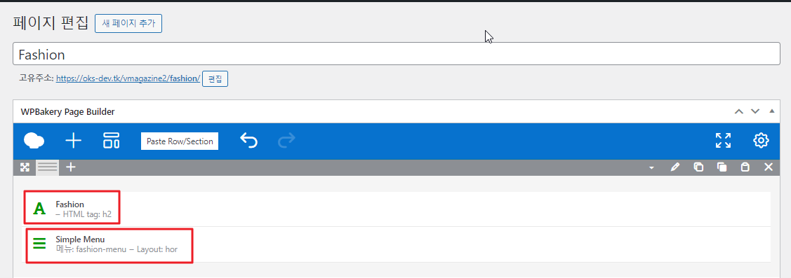 먼저, 페이지의 타이틀(이하 자식 카테고리들에서도 동일한 이름)을 적어주고, '심플 메뉴(simple menu)' 요소를 이용해서 위에서 만든 'fashion-menu' 내비게이션 리스트를 표시해 줍니다.
