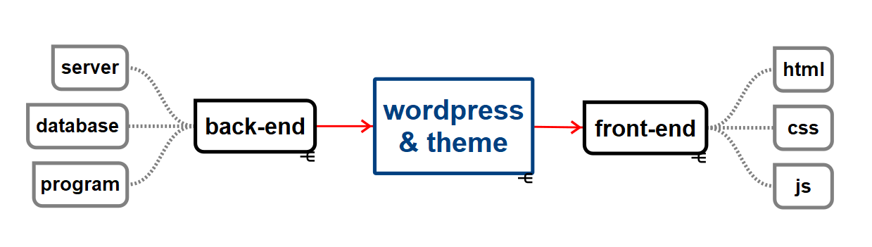 시작에 앞서 간략히 웹의 구조에 대해 알면 접근이 쉬울 수 있습니다. 웹은 브라우저를 통해 보이는 프런트 앤드가 있고, 인터넷의 어느 공간에 콘텐츠가 저장된 백앤드가 있습니다. 그럼 워드프레스와 테마는 웹에서 어떤 역할을 하는가? 이걸 설명하려고 순서도를 그리다 보니 가로로 펼쳐서 이렇게 하면 어느 정도 제가 이해를 하고 있는 그림이 되었습니다.
