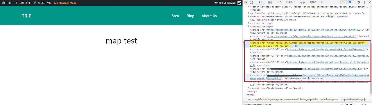 내용 정리를 위해 'map-test'라는 슬러그를 가진 페이지를 하나 만들었고, 이 페이지에 카카오 지도 api가 동작할 스크립트 주소 > 그다음 지도 표시 및 컨트롤을 하기 위한 내 스크립트를 적기 위한 파일이 다음에 오게 조치한 내용입니다.